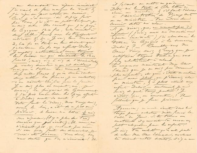 me demandait une réponse immédiate ! J’ai craint de faire manquer la vente & j’ai répondu par retour du courrier. Comme je n’ai aucune idée des prix faits par vous j’ai été au petit bonheur, je me suis dit : Ils savent que j’ai payé les Cigognes 1200 frs, cela revient à deux mille francs avec les transports intérêts &c &c – Je vais leur demander 2,600 frs en tout en leur disant que j’abandonne 600 frs aux enfants Dubois. Je comptais naturellement comme toujours leur laisser ce qui excédait les 1200 francs !, mais vis à vis de l’Administration je voulais démontrer ce qui est d’ailleurs vrai, que ce tableau me revenait à deux mille francs & qu’en demandant deux mille 600 francs, je me contentais d’un modeste bénéfice pour la famille. Je ne suis plus au courant, moi, – je connais la pingrerie du Gouvernement & j’ai pris comme base les prix offerts à Dubois avant sa mort !