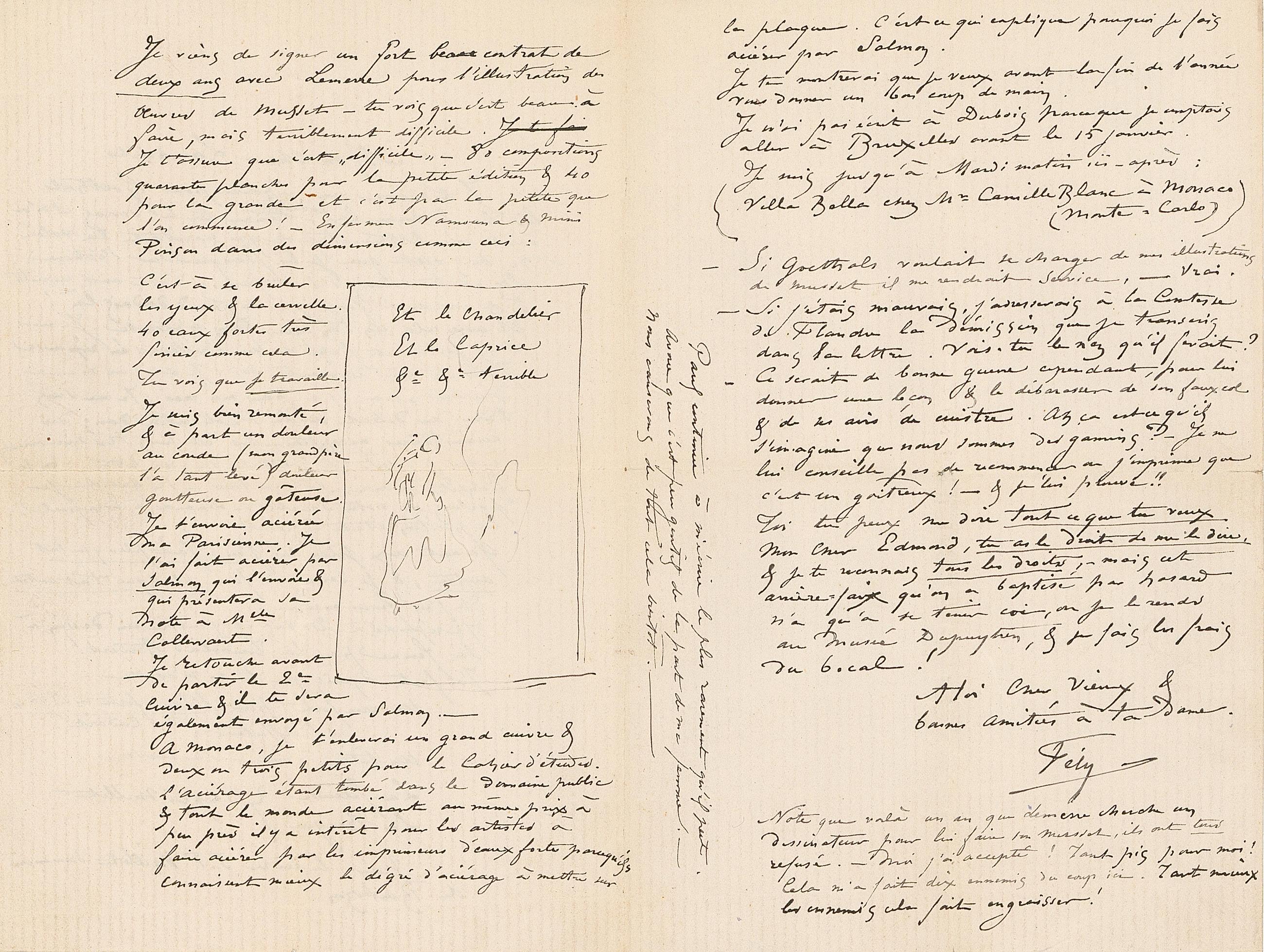 Je viens de signer un fort beau contrat de deux ans avec Lemerre pour l’illustration des œuvres de Musset – tu vois que c’est beau ! à faire, mais terriblement difficile. Je te fais Je t’assure que c’est « difficile ». – 80 compositions quarante planches pour la petite édition & 40 pour la grande et c’est par la petite que l’on commence ! – Enfermen Namsuna & Mimi Pinson dans des dimensions comme ceci :
