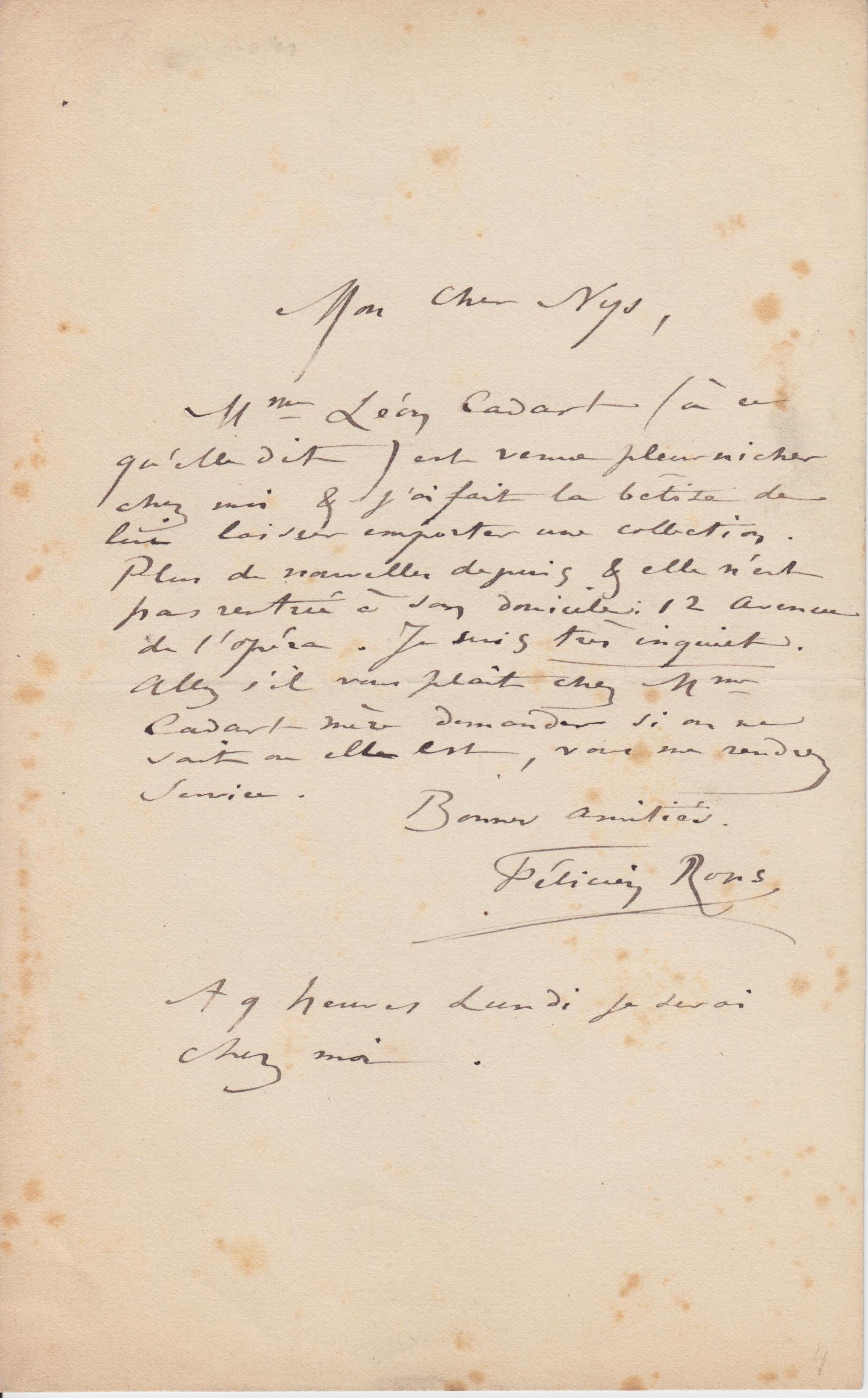 Mme Léon Cadart (à ce qu’elle dit) est venue pleurnicher chez moi & j’ai fait la bêtise de lui laisser emporter une collection. Plus de nouvelles depuis & elle n’est pas rentrée à son domicile : 12 Avenue de l’opéra. Je suis très inquiet. Allez s’il vous plaît chez Mme Cadart mère demander si on ne sait où elle est, vous me rendrez service.
