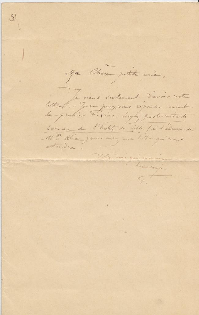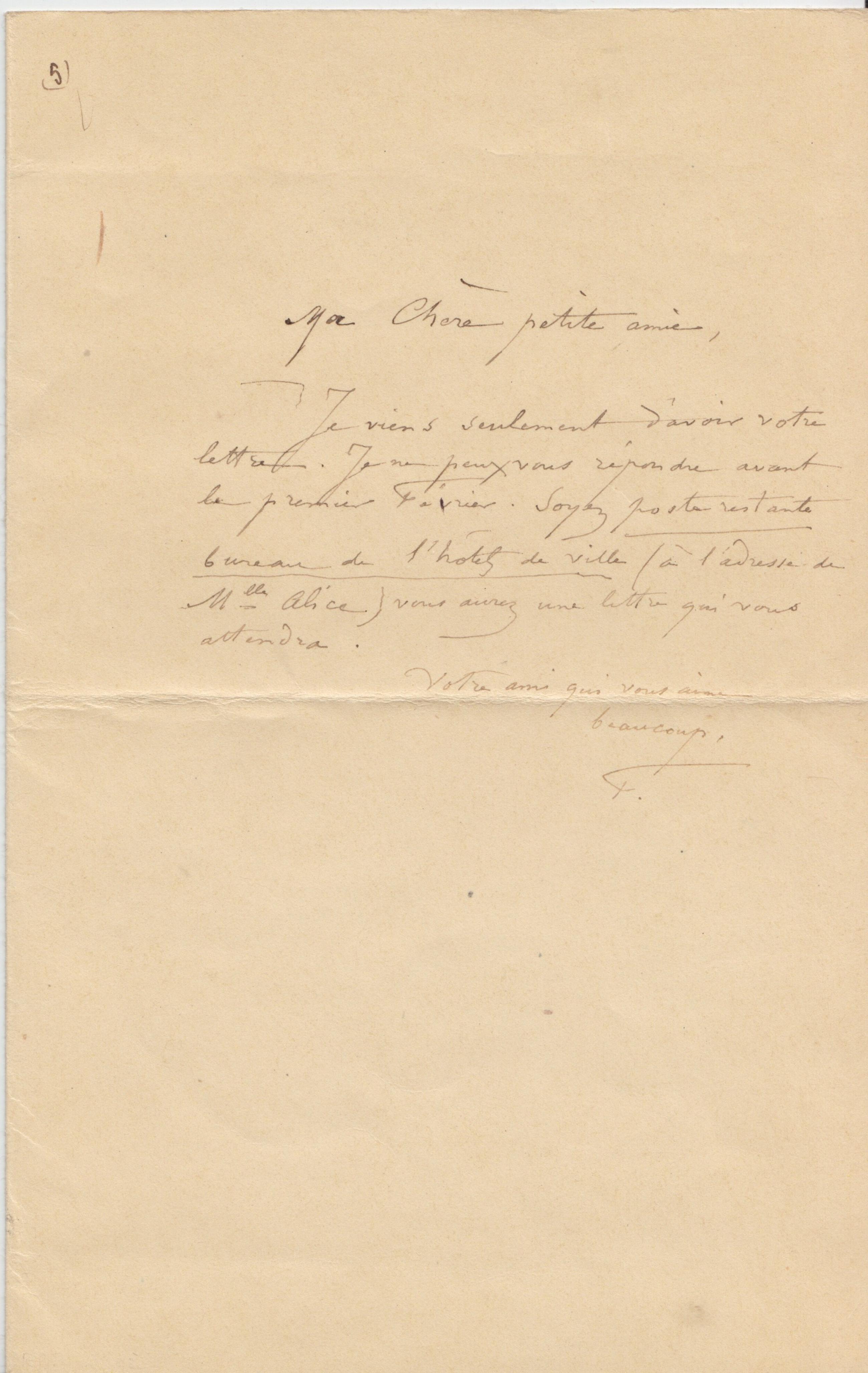 Je viens seulement d’avoir votre lettre. Je ne peux vous répondre avant le premier Février. Soyez poste restante bureau de l’hôtel de ville (à l’adresse de Mlle Alice) vous aurez une lettre qui vous attendra.