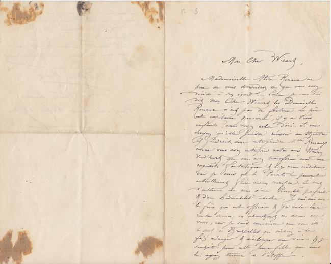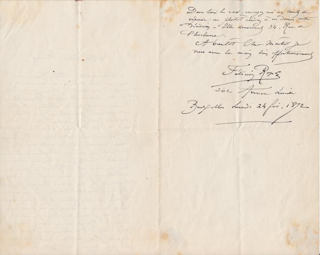 Mademoiselle Alice Renaux me prie de vous demander ce que vous avez décidé à son égard. – Comme je vous l’ai dit mon Cher Wicartles Demoiselles Renaux n’ont pas de fortune. Le père est capitaine pensionné, il y a trois enfants, vous voyez cela d’ici. Si vous croyez qu’elle puisse réussir au théâtre il faudrait donc entreprendre Mlle Renaux comme vous avez entrepris notre ami Henry Verd’hurt que vous avez transformé avec une rapidité fantastique & aux mêmes conditions, car je crois que les Parents ne peuvent actuellement faire aucun sacrifice. Ce sont d’ailleurs des gens d’une honnêteté parfaite et d’une honorabilité absolue. Je suis ami avec le frère qui est officier & j’ai voulu lui rendre service en abouchant ces dames avec vous, car je suis convaincu que vous êtes le seul à Bruxelles qui sachiez à la fois ménager & développer une voix & je souhaite pour cette jeune fille que vous lui ayiez trouvé de l’étoffe.