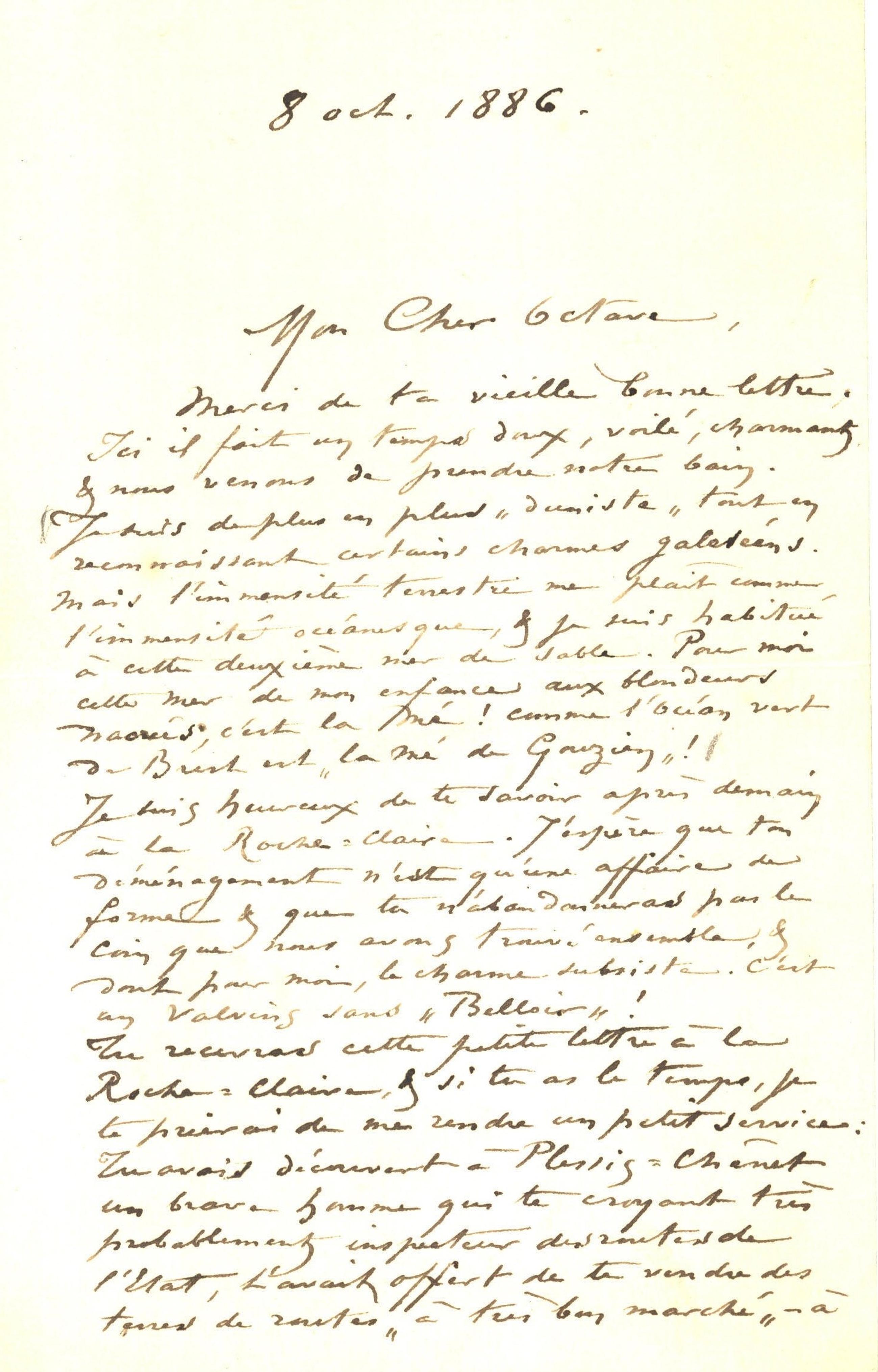 Je suis heureux de te savoir après demain à la Roche-Claire. J’espère que ton déménagement n’est qu’une affaire de forme & que tu n’abandonneras pas le coin que nous avons trouvé ensemble, & dont pour moi, le charme subsiste. C’est un Valvins sans « Belloir » !
