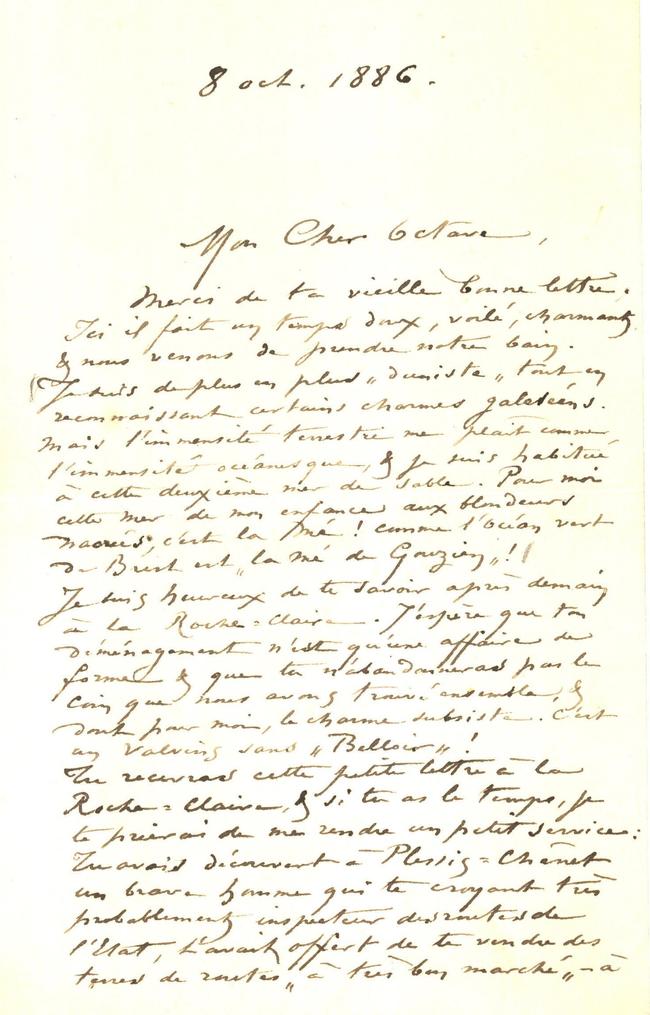 Tu recevras cette petite lettre à la Roche-Claire, & si tu as le temps, je te prierai de me rendre un petit service : Tu avais découvert à Plessis-Chênet un brave homme qui te croyant très probablement inspecteur des routes de l’État, t’avait offert de te vendre des terres de routes « à très bon marché » ‒ à