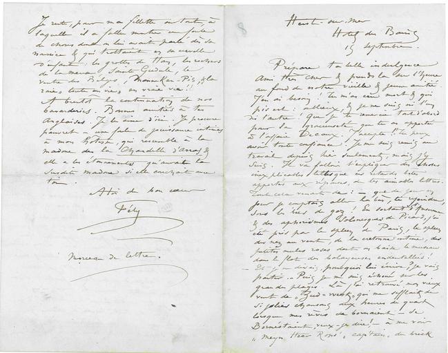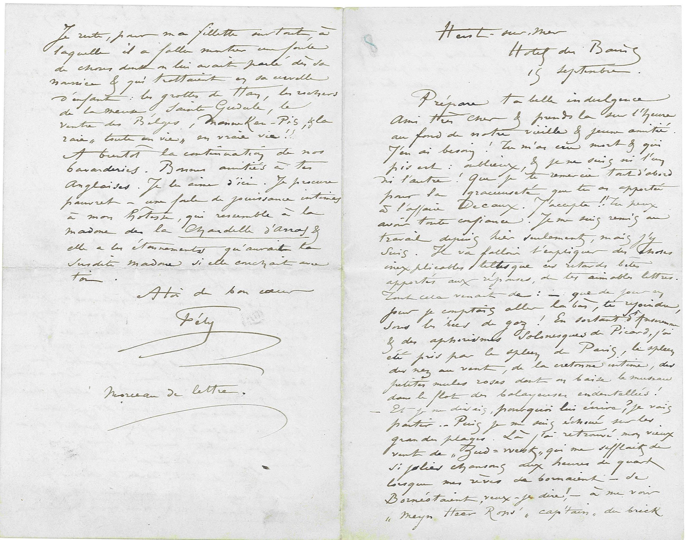 À bientôt la continuation de nos bavarderies. Bonnes amitiés à tes Anglaises. Je les aime d’ici. Je procure pauvret – une foule de jouissances intimes à mon hôtesse, qui ressemble à la madone de la Chandelle d’Arras & elle a les étonnements qu’aurait la susdite madone si elle couchait avec toi.