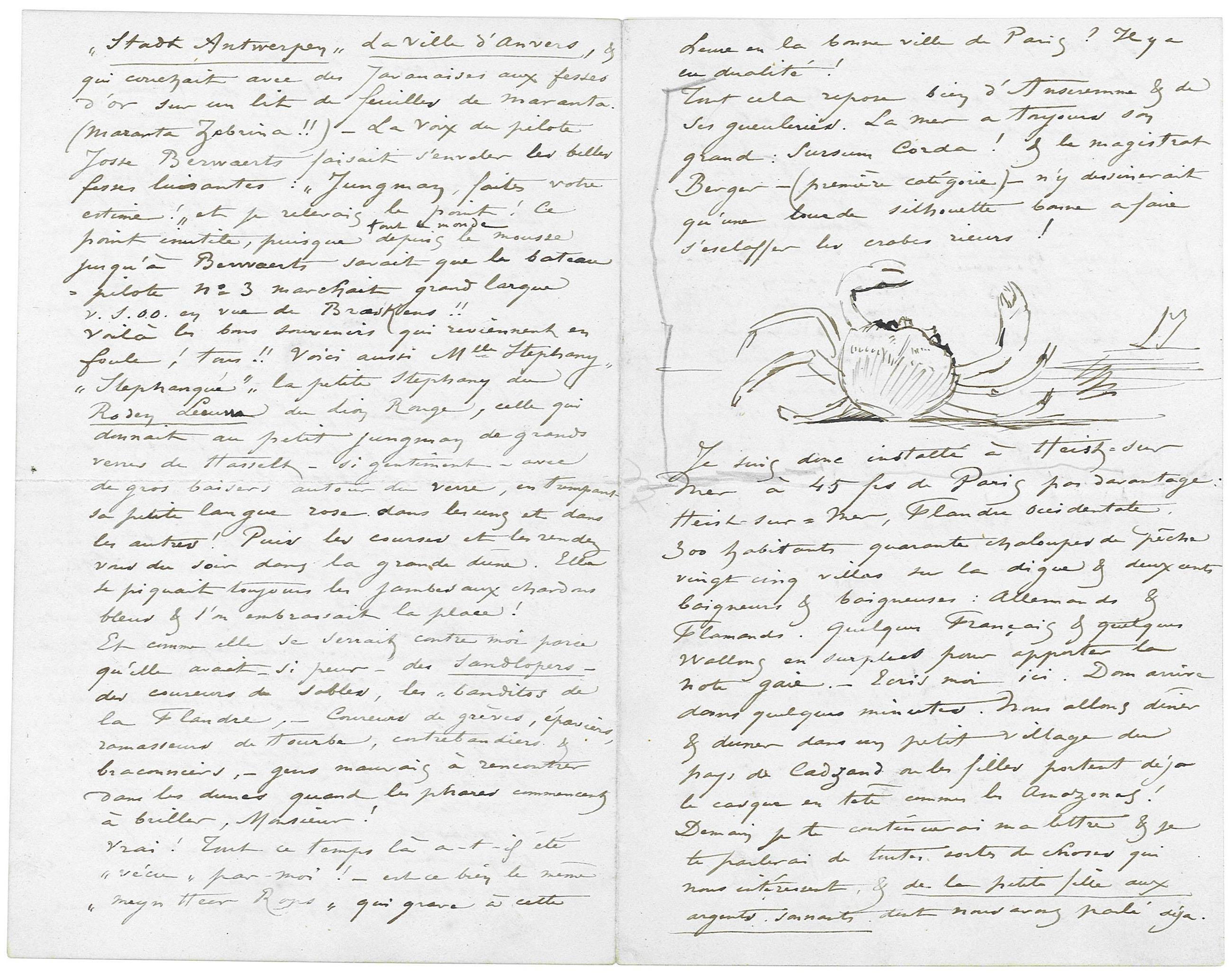 Je suis donc installé à Heist-sur mer à 45 frs de Paris pas davantage : Heist sur-mer, Flandre Occidentale. 300 habitants quarante chaloupe de pêche vingt cinq villas sur la digue & deux cents baigneurs & baigneuses : Allemands & Flamands. Quelques Français & quelques Wallons en surplus pour apporter la note gaie. – Écris moi ici. Dom arrive dans quelques minutes. Nous allons dîner & duner dans un petit village du pays de Cadzand où les filles portent déja le casque en tête comme les Amazones ! Demain je te continuerai ma lettre & je te parlerai de toutes sortes de choses qui nous intéressent, & de la petite fille aux argents sonnantsdont nous avons parlé déjà.