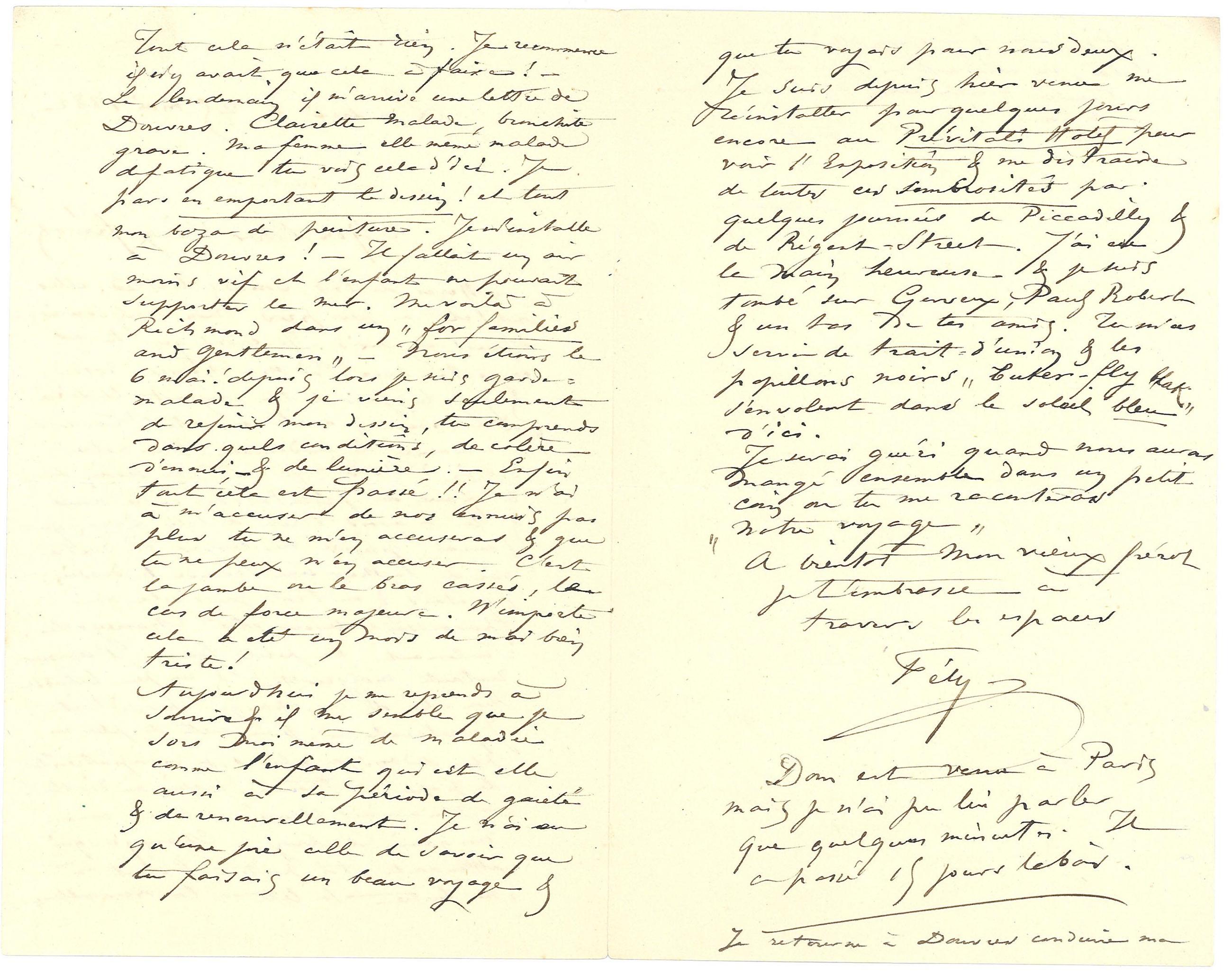 Tout cela n’était rien. Je recommence il n’y avait que cela à faire ! – Le lendemain il m’arrive une lettre de Douvres. Clairette malade, bronchite grave. Ma femme elle même malade de fatigue tu vois cela d’ici. Je pars en emportant le dessin ! et tout mon boza de peinture. Je m’installe à Douvres ! – Il fallait un air moins vif et l’enfant ne pouvait supporter la mer. Me voilà à Richmond dans un « for families and gentlemen » – Nous étions le 6 mai ! depuis lors je suis garde-malade & je viens seulement de refinir mon dessin, tu comprends dans quels conditions, de colère d’ennui – & de lumière. – Enfin tout cela est passé !! Je n’ai à m’accuser de nos ennuis pas plus tu ne m’en accuseras & que tu ne peux m’en accuser. C’est la jambe ou le bras cassés, le cas de force majeure. N’importe cela a été un mois de mai bien triste !