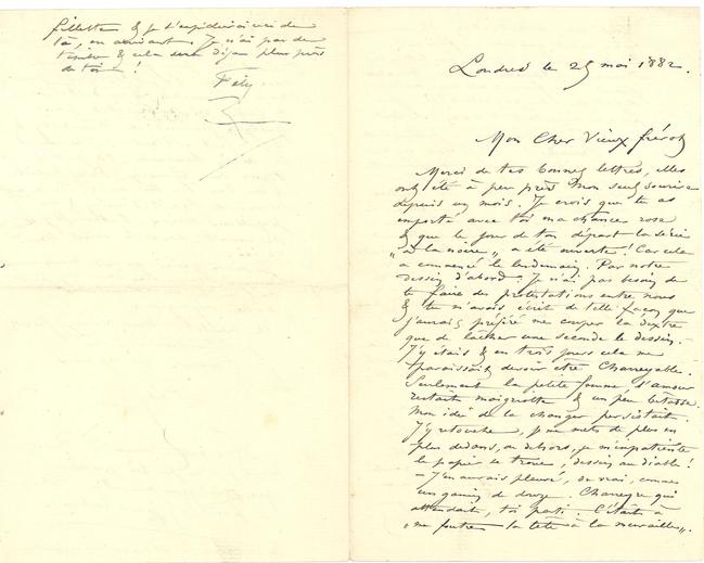 Je suis depuis hier venu me réinstaller pour quelques jours encore au Prévitatis Hôtel pour voir l’Exposition & me distraire de toutes ces sombrosités par quelques journées de Piccadily & de Regent-Street. J’ai eu la main heureuse & je suis tombé sur Gerveix, Paul Robert & un tas de tes amis. Tu m’as servi de trait-d’union & les papillons noirs « buter-fly blak » s’envolent dans le soleil bleu d’ici.