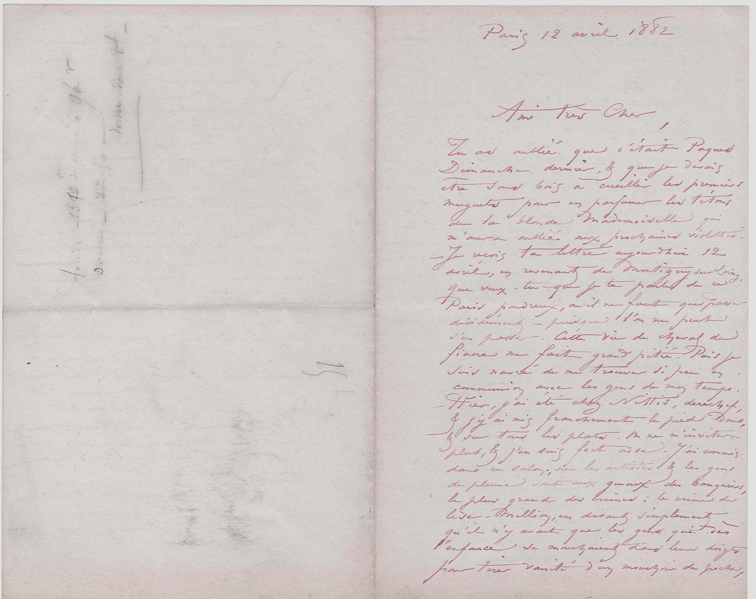 – Je reçois ta lettre aujourd’hui 12 avril, en revenant de Montigny sur Loing. Que veux-tu que je te parle de ce Paris poudreux, où il ne faut que passer décidément – puisque l’on ne peut s’en passer. Cette vie de cheval de fiacre me fait grand pitié. Puis je suis navré de me trouver si peu en communion avec les gens de mon temps.
