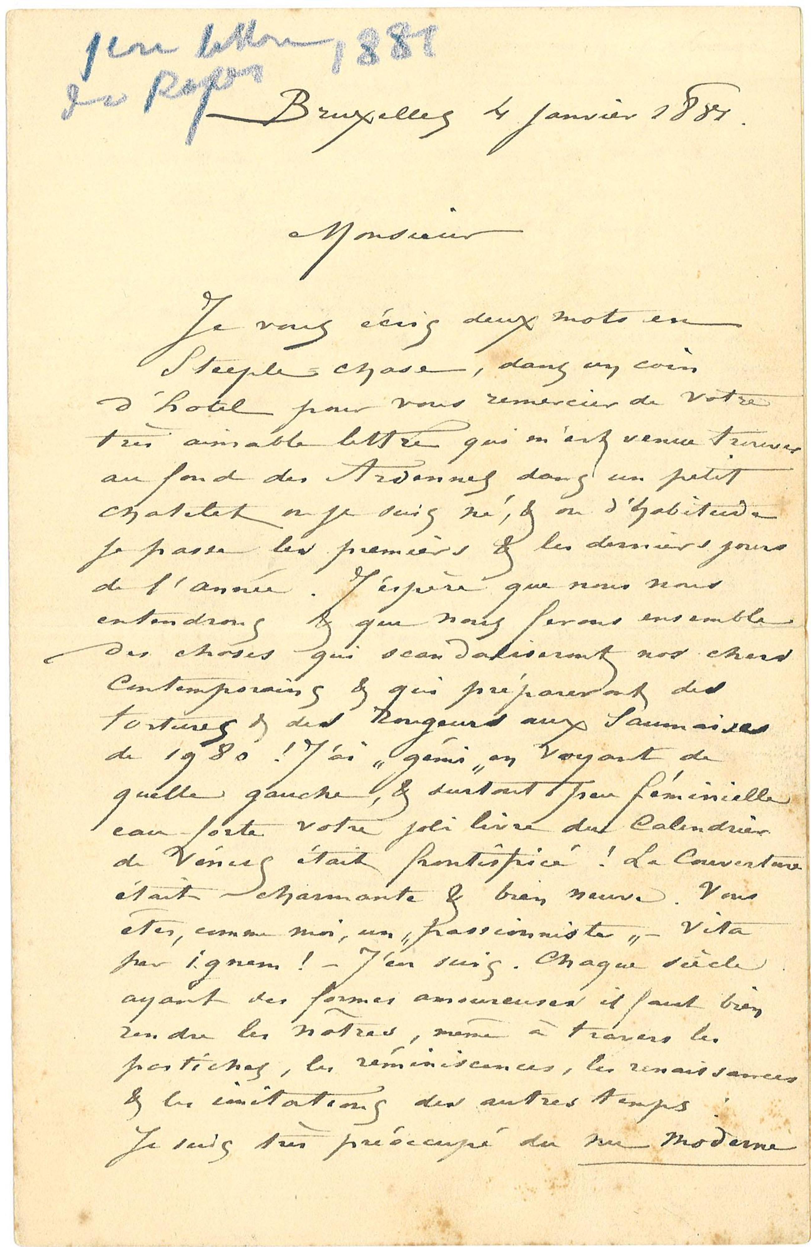 Je vous écris deux mots en Steeple chase, dans un coin d’hotel pour vous remercier de votre très aimable lettre qui m’est venue trouver au fond des Ardennes dans un petit chatelet où je suis né, & où d’habitude je passe les premiers & les derniers jours de l’année. J’espère que nous nous entendrons & que nous ferons ensemble des choses qui scandalisent nos chers Contemporains & qui prépareront des tortures & des rougeurs aux Saumaises de 1980 ! J’ai « gémi » en voyant de quelle gauche, & surtout peu féminielle eau-forte votre joli livre du Calendrier de Vénus était frontispicé ! La Couverture était charmante & bien neuve. Vous êtes, comme moi, un « passionniste » – Vita per ignem ! – J’en suis. Chaque siècle ayant des femmes amoureuses il faut bien rendre les nôtres, même à travers les pastiches, les réminiscences, les renaissances & les imitations des autres temps : Je suis très préoccupé du nu moderne