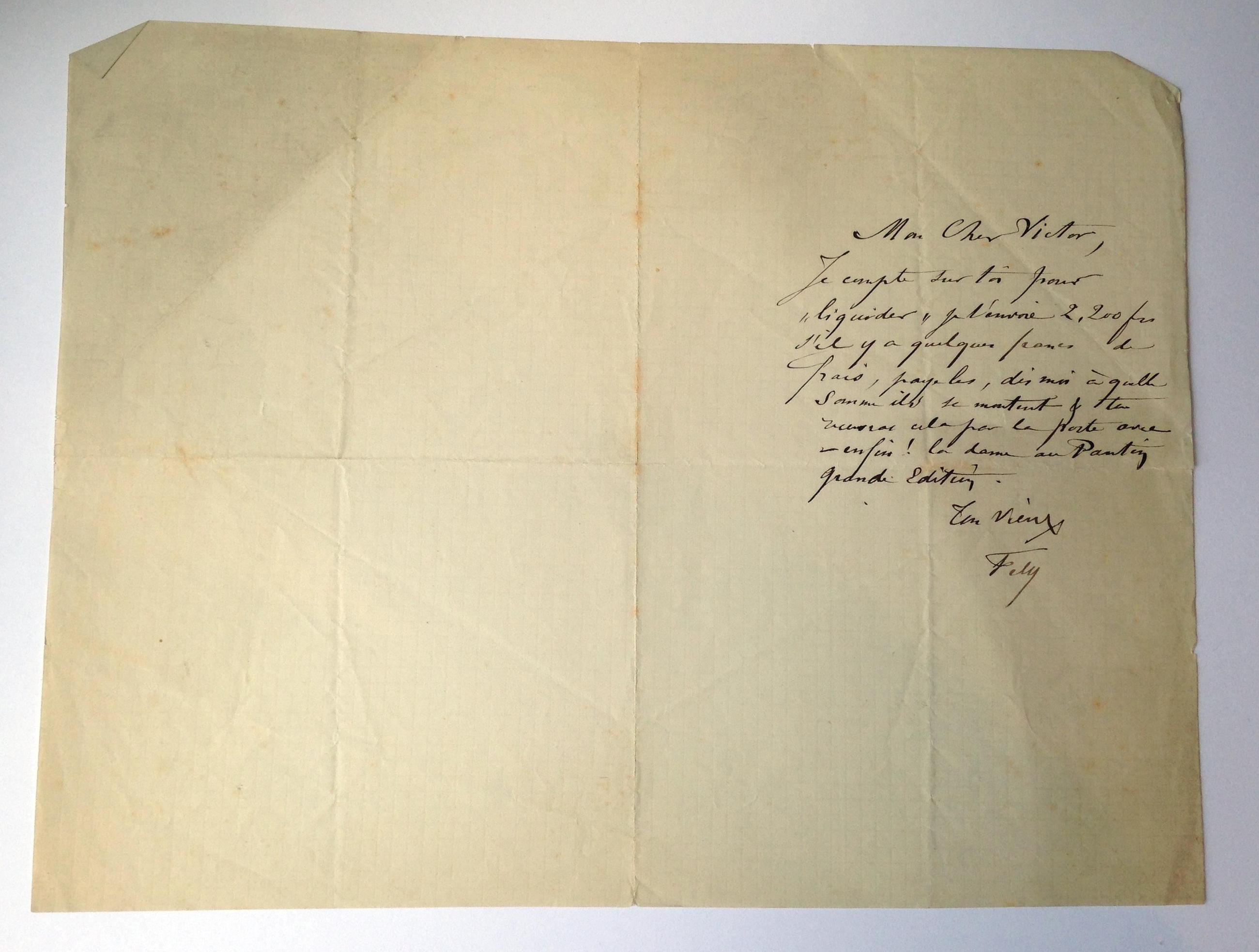 Je compte sur toi pour « liquider » je t’envoie 2,200 frs s’il y a quelques francs de frais, paye les, dis moi à quelle somme ils se montent & tu recevras cela par la poste avec – enfin ! la dame au Pantin Grande Édition.