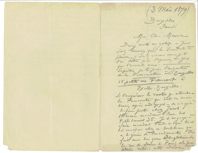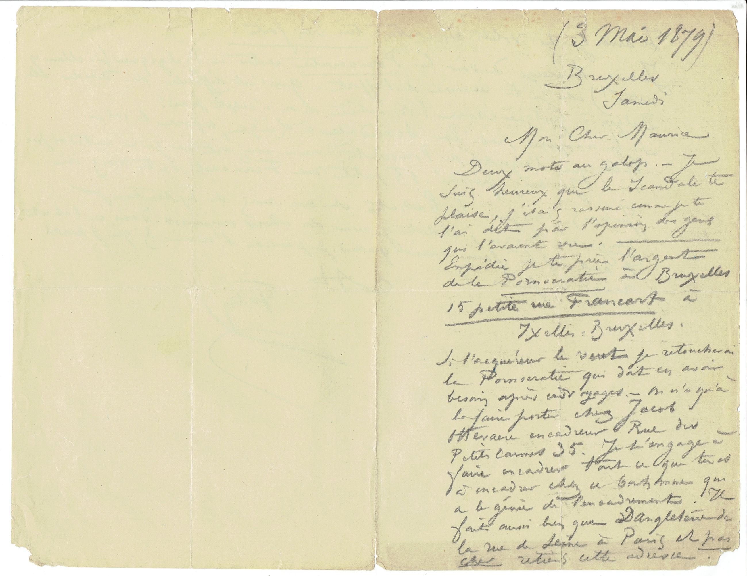 Si l'acquéreur le veut, je retoucherai la Pornocratie qui en avoir besoin après ces voyages. - On n'a qu'à la faire porter chez Jacob Ottevaere encadreur Rue des Petits Carmes 35. Je t'engage à faire encadrer tout ce que tu as à encadrer chez ce bonhomme qui a le génie de l'encadrement. Il fait aussi bien que Dangleterre de la rue de Seine à Paris et pas cher retiens cette adresse.