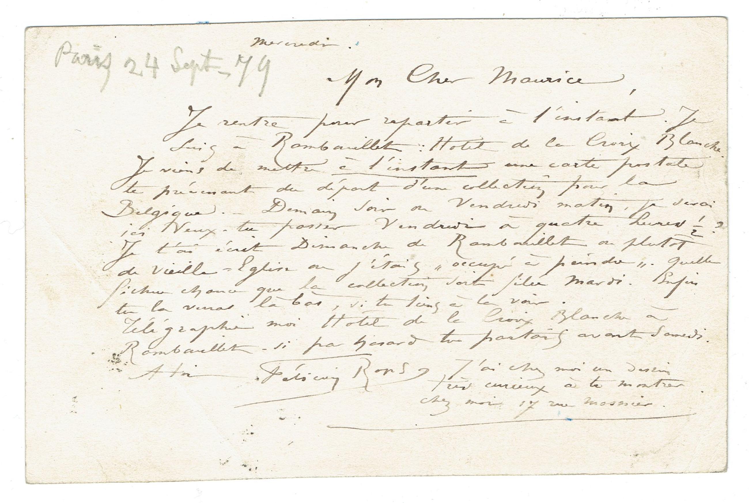 Je rentre pour repartir à l’instant. Je suis à Rambouillet : Hotel de la Croix Blanche. Je viens de mettre à l’instant une carte postale te prévenant du départ d’une collection pour la Belgique. ‒ Demain soir ou Vendredi matin, je serai ici. Veux-tu passer Vendredi à quatre heures ½ ? Je t’ai écrit Dimanche de Rambouillet ou plutôt de Vieille-Église où j’étais « occupé à peindre ». Quelle fichue chance que la collection soit filée Mardi. Enfin tu la verras là bàs, si tu tiens à la voir.