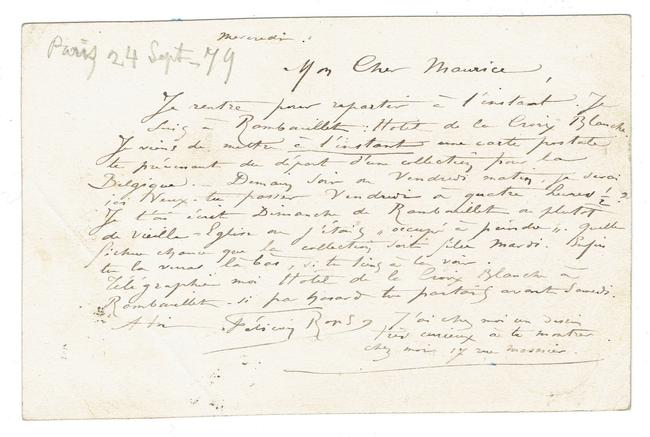 Télégraphie moi Hôtel de la Croix Blanche à Rambouillet ‒ si par hasard tu partais avant Samedi.