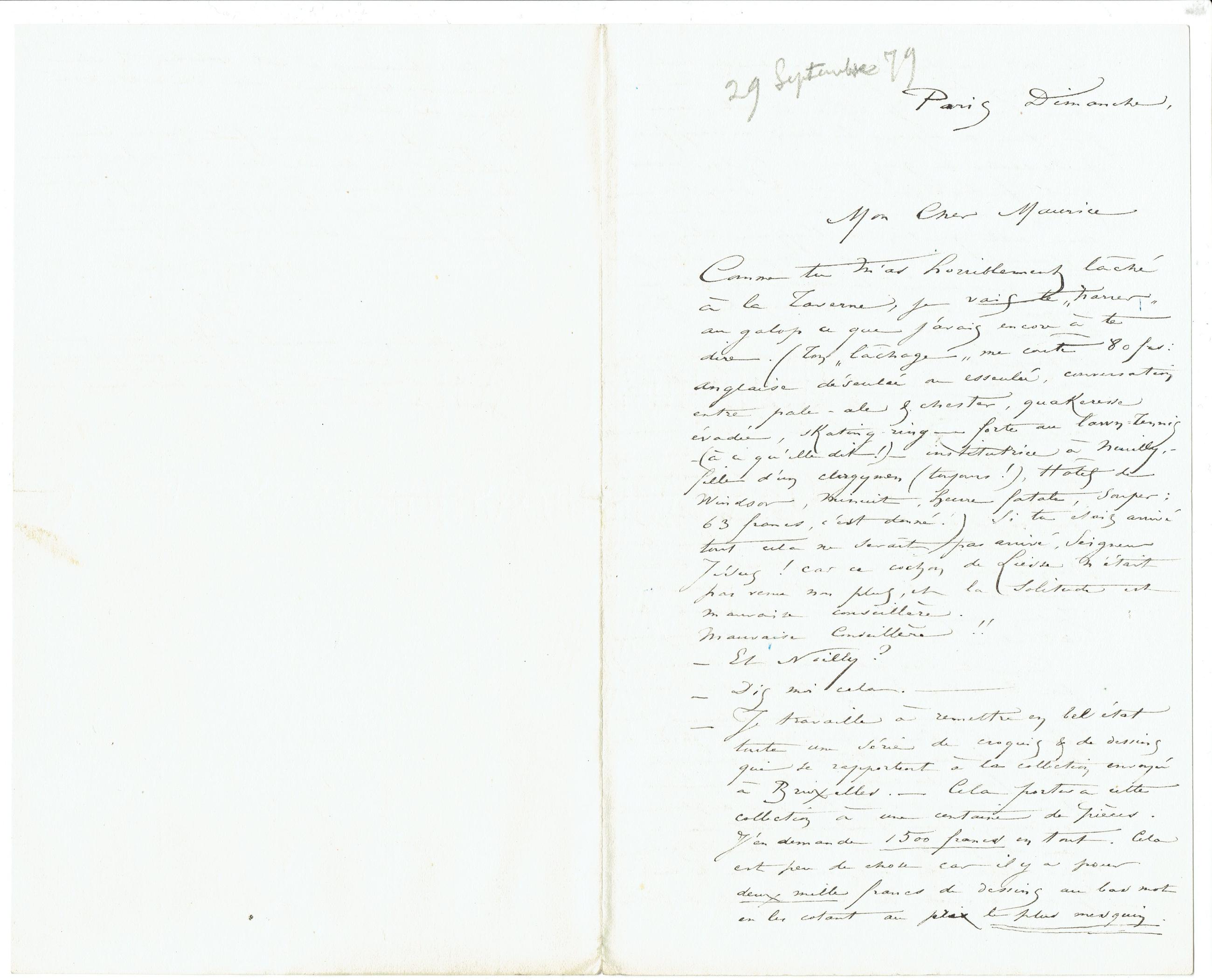 Comme tu m’as horriblement lâché à la Taverne, je vais te « narrer » au galop ce que j’avais encore à te dire. (Ton « lâchage » me coûte 80 frs : anglaise déseulée ou esseulée, conversation entre pale-ale & chester, quakeresse évadée, skating-ring ‒ forte au lawn-tennis – (à ce qu’elle dit !) – institutrice à Neuilly, ‒ fille d’un clergymen (toujours !), Hôtel de Windsor, minuit, heure fatale, souper : 63 francs, c’est donné !) Si tu étais arrivé tout cela ne serait pas arrivé, Seigneur Jésus ! car ce cochon de Liesse n’était pas venu non plus, et la solitude est mauvaise conseillère.