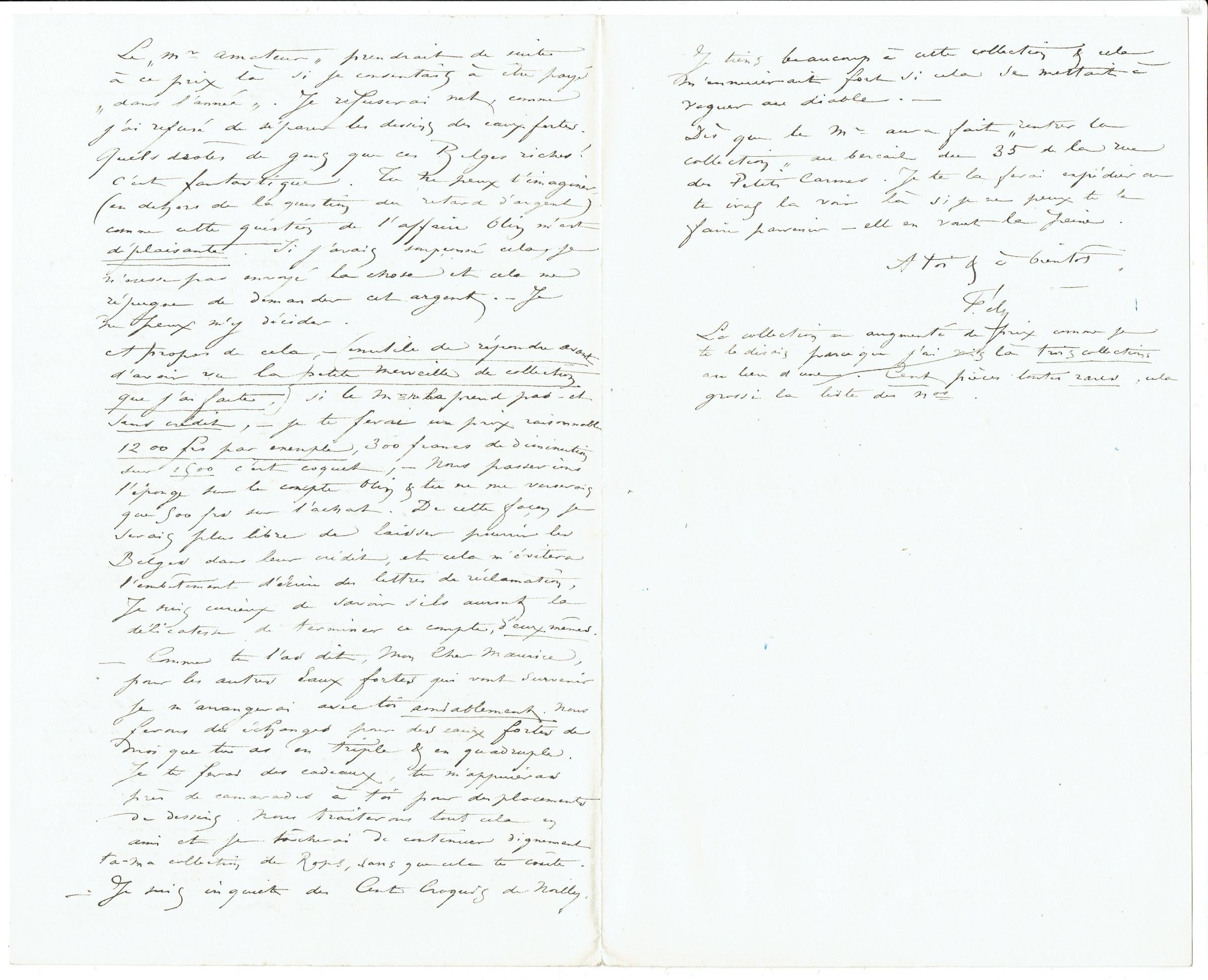 ‒ Comme tu l’as dit, Mon Cher Maurice, pour les autres Eaux fortes qui vont survenir je m’arrangerai avec toi aimablement. Nous ferons des échanges pour des eaux fortes de moi que tu as en triple & en quadruple. Je te ferai des cadeaux, tu m’appuieras près de camarade à toi par des placements de dessins. Nous traiterons de tout cela en ami et je tâcherai de continuer dignement ta-ma collection de Rops, sans que cela te coûte.