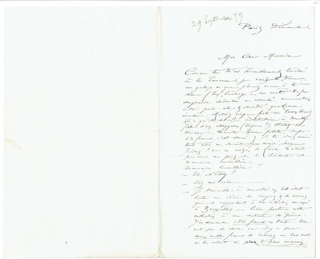 ‒ Je travaille à remettre en bel état toute une série de croquis & de dessins qui se rapportent à la collection envoyée à Bruxelles. ‒ Cela portera cette collection à une centaine de pièces. J’en demande 1500 francs en tout. Cela est peu de chose car il y a pour deux mille francs de dessins au bas mot en les cotant au prix le plus mesquin.