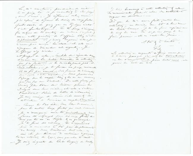 À propos de cela, – (inutile de répondre avant d’avoir vu la petite merveille de collection que j’ai faite,) si le Mr ne la prend pas ‒ et sans crédit, ‒ je te ferai un prix raisonnable 1200 frs par exemple, 300 francs de diminution sur 1500 c’est coquet, ‒ Nous passerions l’éponge sur le compte Olin & tu ne me verserais que 500 frs sur l’achat. De cette façon je serais plus libre de laisser pourrir les Belges dans leur crédit, et cela m’évitera l’embêtement d’écrire des lettres de réclamation. Je suis curieux de savoir sils auront la délicatesse de terminer ce compte, d’eux-mêmes.