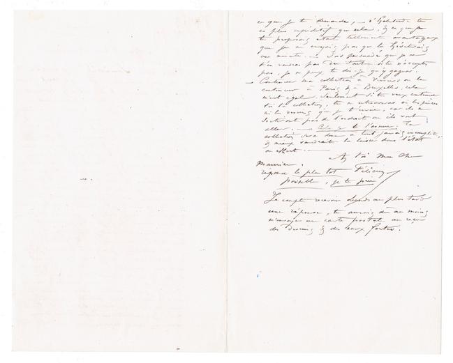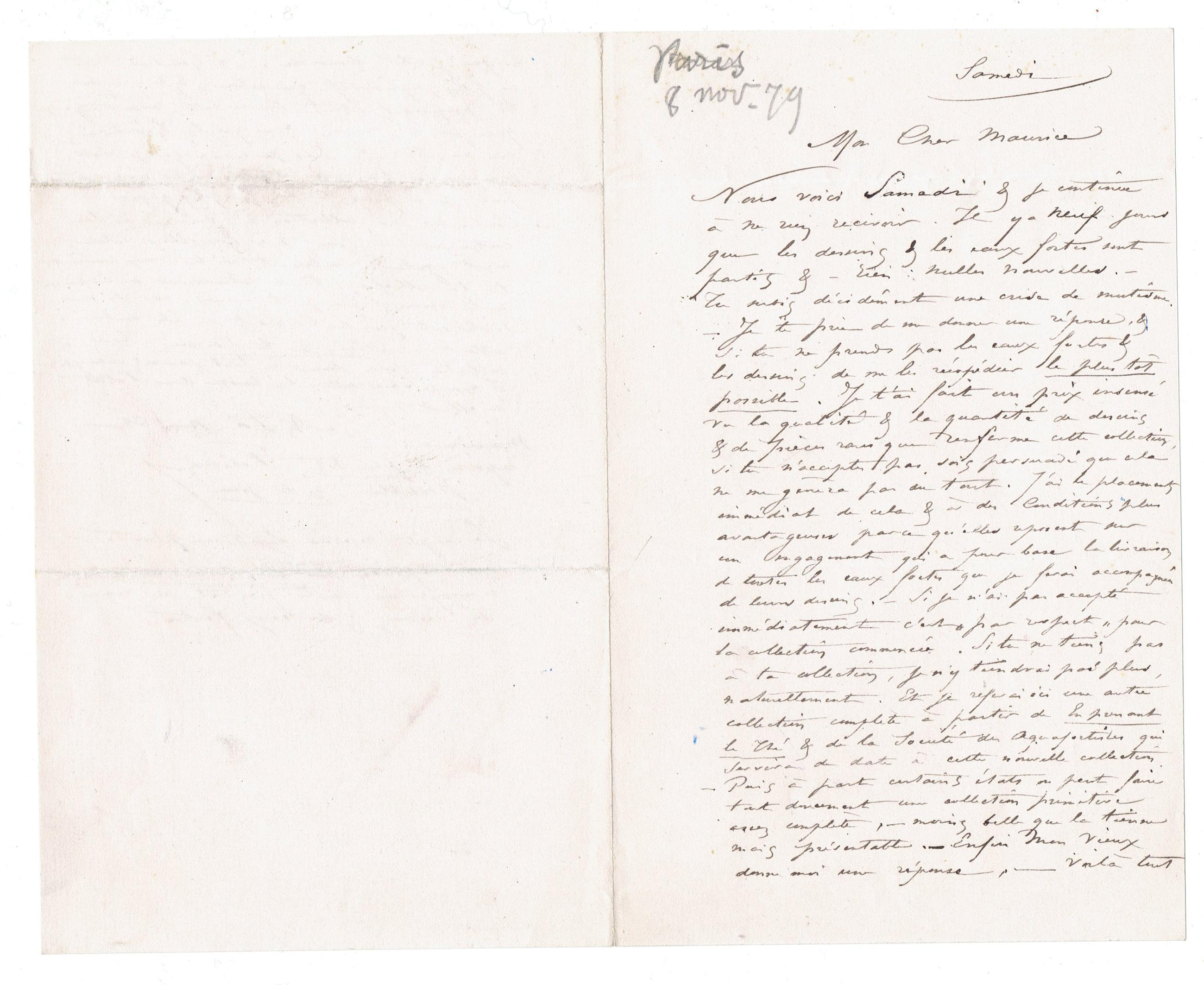 Nous voici Samedi & je continue à ne rien recevoir. Il y a neuf jours que les dessins & les eaux fortes sont partis & − rien : nulles nouvelles. − Tu subis décidément une crise de mutisme. − Je te prie de me donner une réponse, & si tu ne prends pas les eaux fortes & les dessins de me les réexpédier le plus tôt possible. Je t'ai fait un prix insensé vu la qualité & la quantité de dessins & de pièces rares que renferme cette collection, si tu n'acceptes pas sois persuadé que cela ne me gênera pas du tout. J'ai le placement immédiat de cela & à des conditions plus avantageuses parce qu'elles reposent sur un engagement qui a pour base la livraison de toutes les eaux fortes que je ferai accompagnées de leurs dessins. − Si je n'ai pas accepté immédiatement c'est « par respect » pour la collection commencée. Si tu ne tiens pas à ta collection, je n'y tiendrai pas plus, naturellement. Et je referai ici une autre collection complète à partir de En prenant le Thé & de la Société des Aquafortistes qui servira de date à cette nouvelle collection.