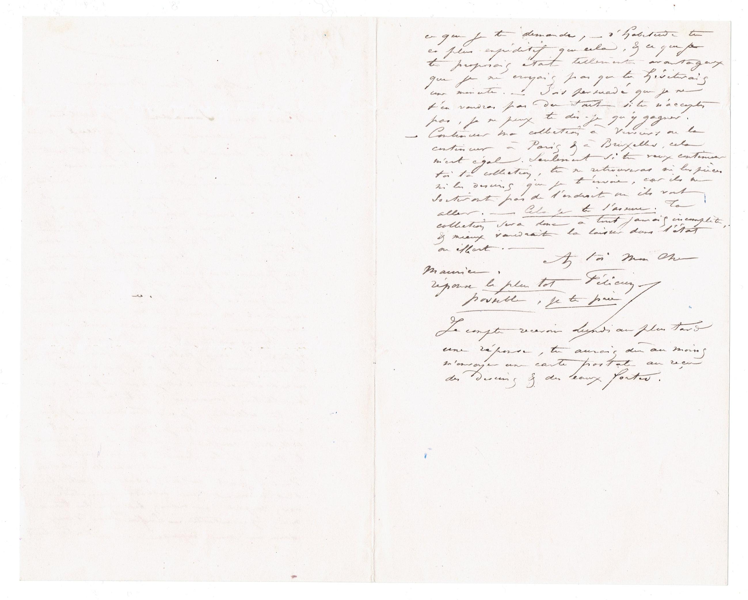 − Continuer ma collection à Verviers ou la continuer à Paris & à Bruxelles, cela m'est égal. Seulement si tu veux continuer toi ta collection, tu ne retrouveras ni les pièces ni les dessins que je t'envoie, car ils ne sortiront pas de l'endroit où ils vont aller. − Cela je te l'assure. Ta collection sera donc à tout jamais incomplète, & mieux vaudrait la laisser dans l'état où elle est. −