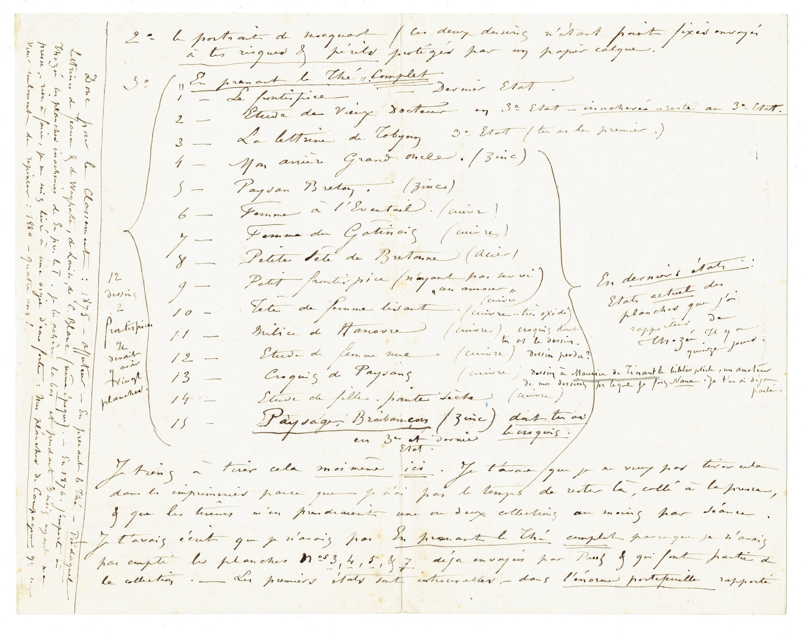 Je tiens à tirer cela moi mêmeici. Je t'avoue que je ne veux pas tirer cela dans les imprimeries parce que je n'ai pas le temps de rester là, collé à la presse, & que les tireurs m'en prendraient une ou deux collections au moins par séance. Je t'avais écrit que je n'avais pas En prenant le Thé complet parce que je n'avais pas compté les planches nos3, 4, 5, & 7 déja envoyées par Paul & qui font partie de la collection. ‒ Les premiers états sont introuvables, ‒ dans l'énorme portefeuille rapporté