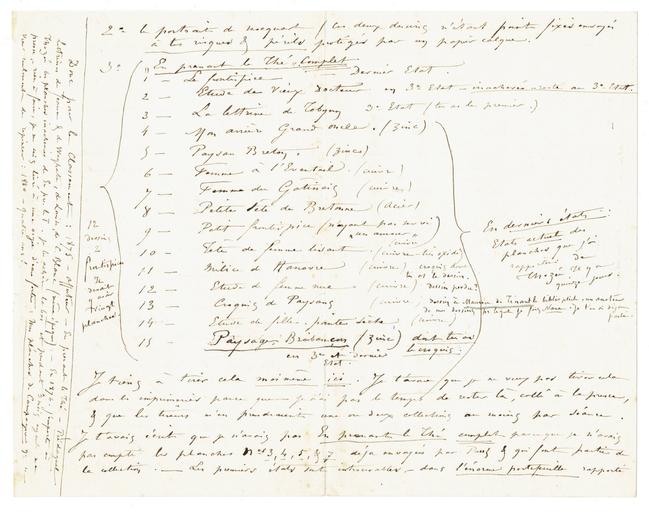 Il y a un personnage très grand, avec figures (une de ces figures est l'étude qui a servi au frontispice de Piédagnelune de mes meilleures planches. ‒ Une grande étude de pommiers en fleurs avec figures ; ‒ La « chambres meublées » dont tu dois avoir eu le premier croquis, ‒ des Bretonnes et des Bretons. ‒ Un paysan à Brouette &c. &c. Tu verras tout cela dans la collection que j'ai gardée.