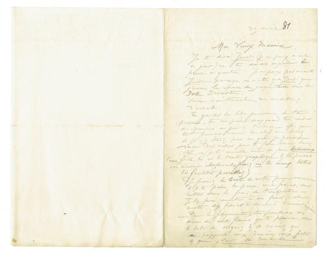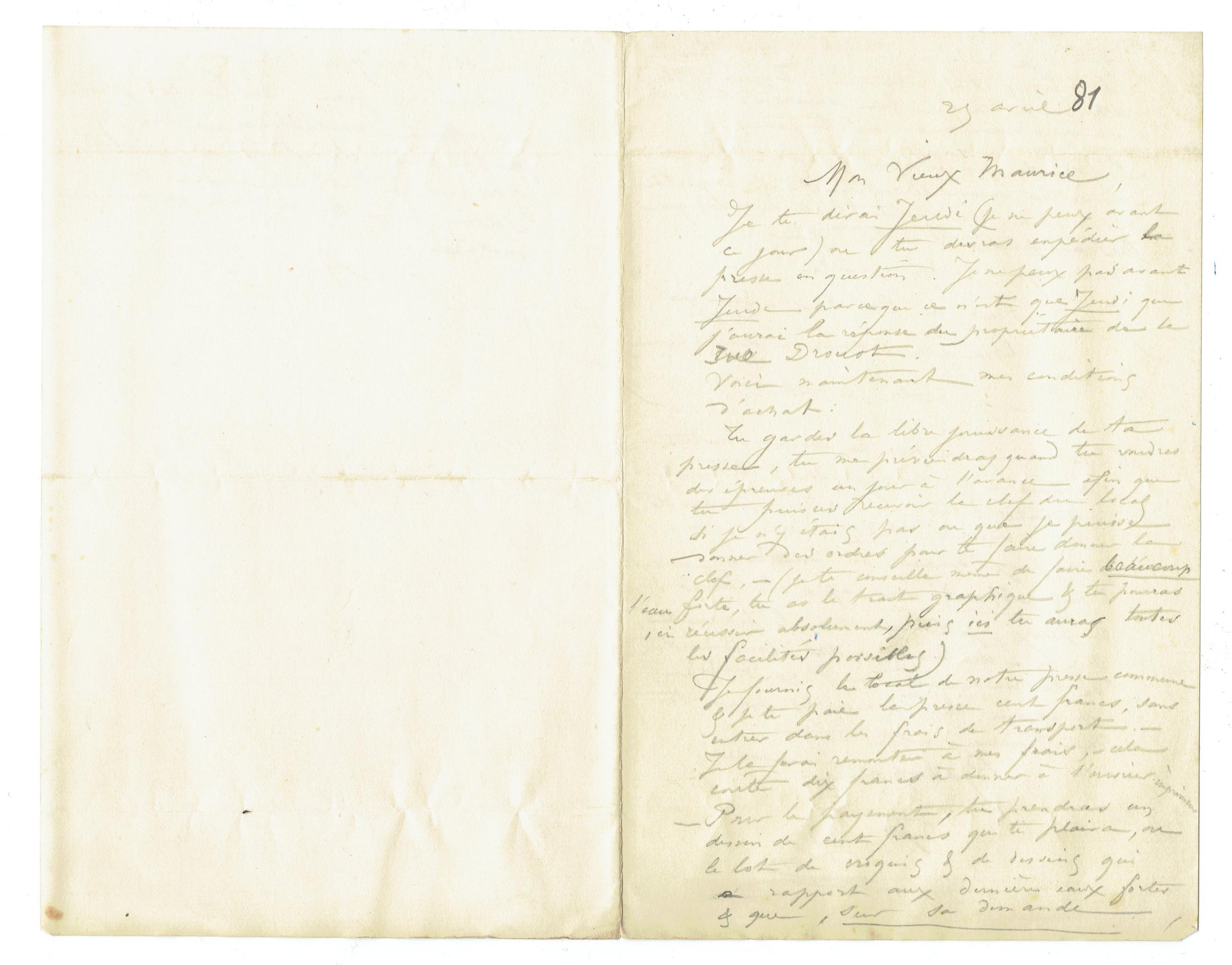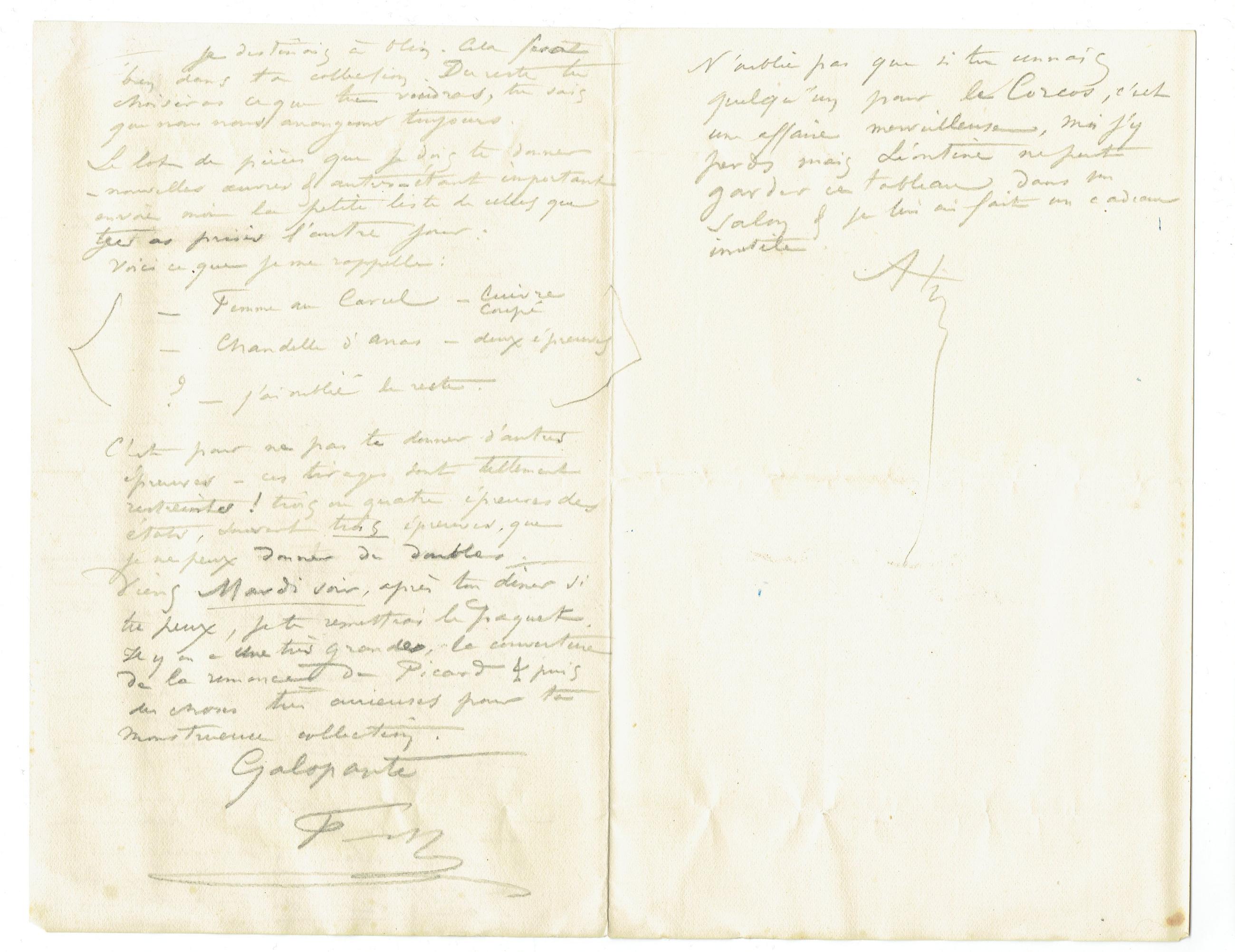 Je te dirai Jeudi (je ne peux avant ce jour) où tu devras expédier la presse en question. Je ne peux pas avant Jeudi parce que ce n'est que Jeudi que j'aurai la réponse du propriétaire de la rue Drouot. Voici maintenant mes conditions d'achat: Tu gardes la libre jouissance de ta presse, tu me préviendras quand tu voudras des épreuves un jour à l'avance afin que tu puisses recevoir la clef du local si je n'y étais pas ou que je puisse donner des ordres pour te faire donner la clef, – (je te conseille même de faire beaucoup l'eau forte, tu as le trait graphique & tu pourras ici réussir absolument, puis ici tu auras toutes les facilités possibles.) Je fournis le local de notre presse commune & je te paie la presse cent francs, sans entrer dans les frais de transport. – Je la ferai remonter à mes frais, cela coûte dix francs à donner à l'ouvrier imprimeur. – Pour le payement, tu prendras un dessin de cent francs qui te plaira, ou le lot de croquis & de dessins qui a rapport aux dernières eaux fortes & que, sur sa demande,