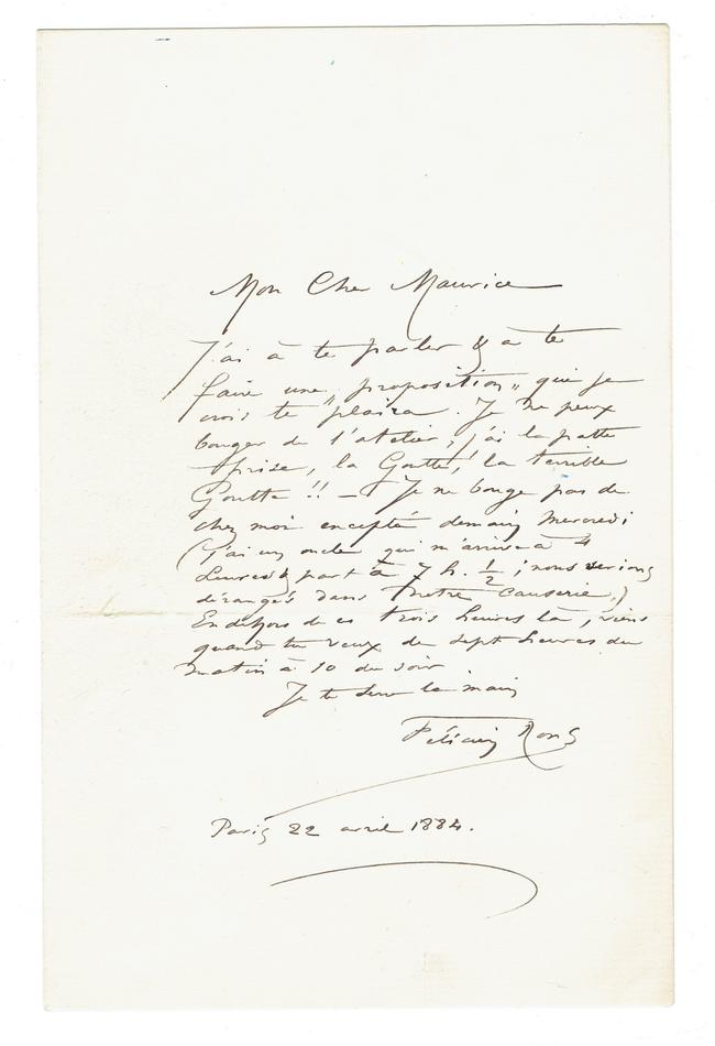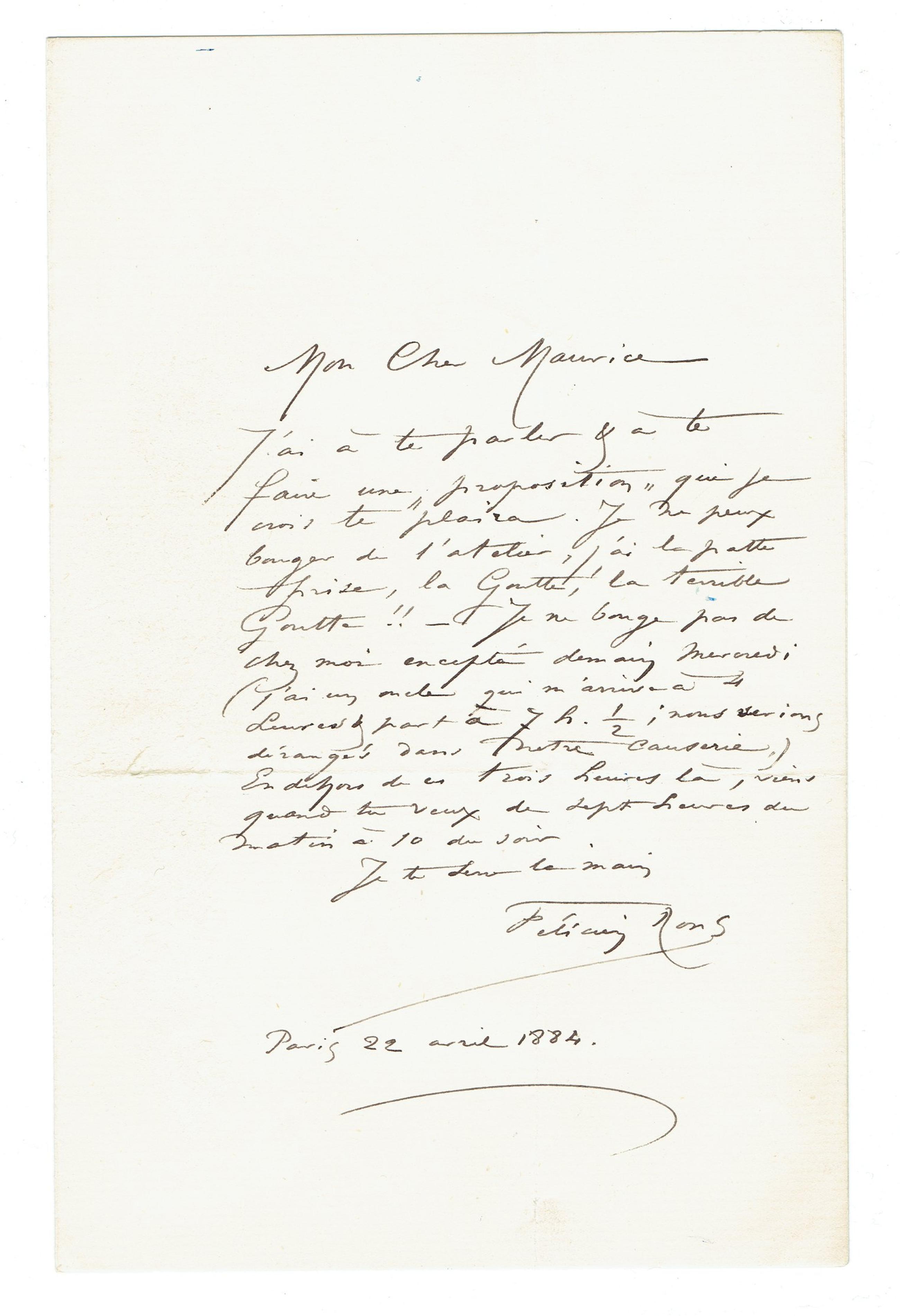 J'ai à te parler & à te faire une « proposition » qui je crois te plaira. Je ne peux bouger de l'atelier, j'ai la patte prise, la Goutte, la terrible Goutte !! – Je ne bouge pas de chez moi excepté demain Mercredi (j'ai un oncle qui m'arrive à 4 heures & part à 7h. ½ ; nous serions dérangés dans notre causerie.) En dehors de ces trois heures là, viens quand tu veux de sept heures du matin à 10 du soir.