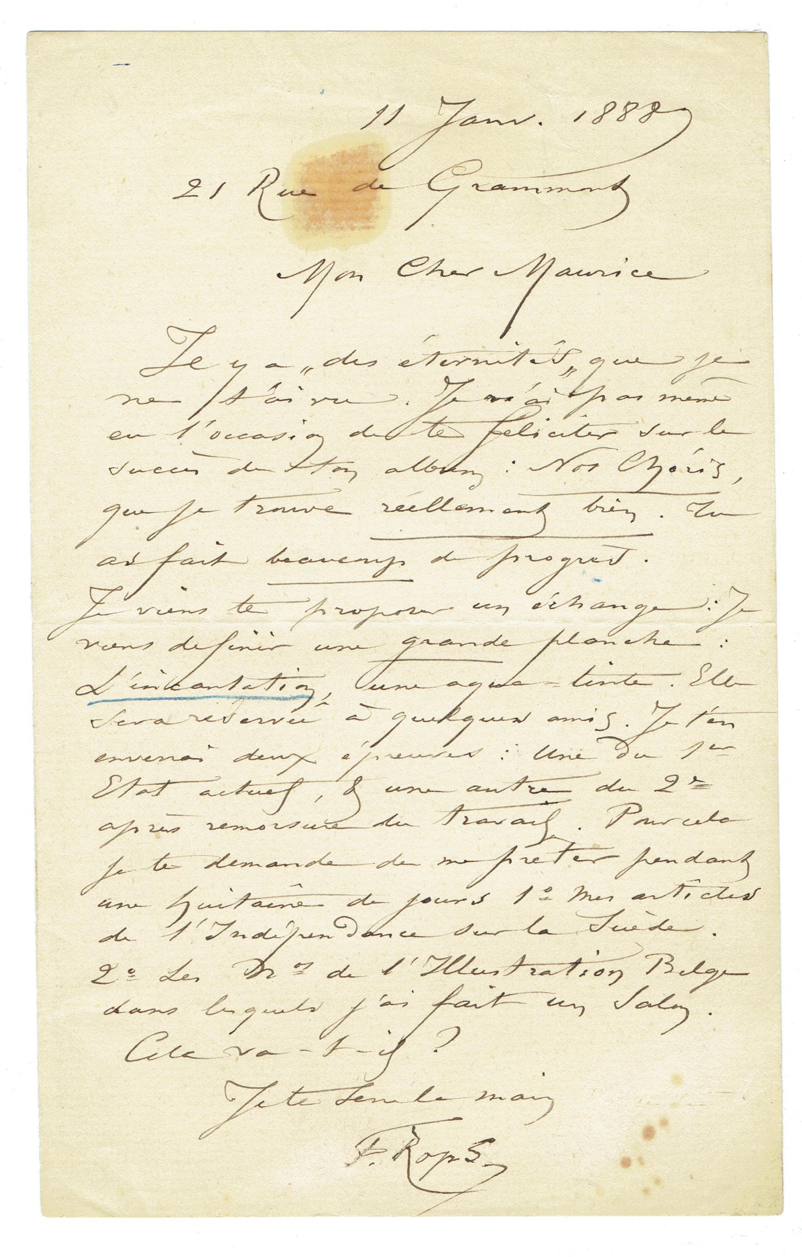 Je viens te proposer un échange : Je viens de finir une grande planche : L'incantation, une aqua-tinte. Elle sera réservée à quelques amis. Je t'en enverrai deux épreuves : Une du 1er État actuel, & une autre du 2e après remorsure du travail. Pour cela je te demande de me prêter pendant une huitaine de jours 1° Mes articles de l'Indépendance sur la Suède. 2° Les nos de l'Illustration Belge dans lesquels j'ai fait un Salon.
