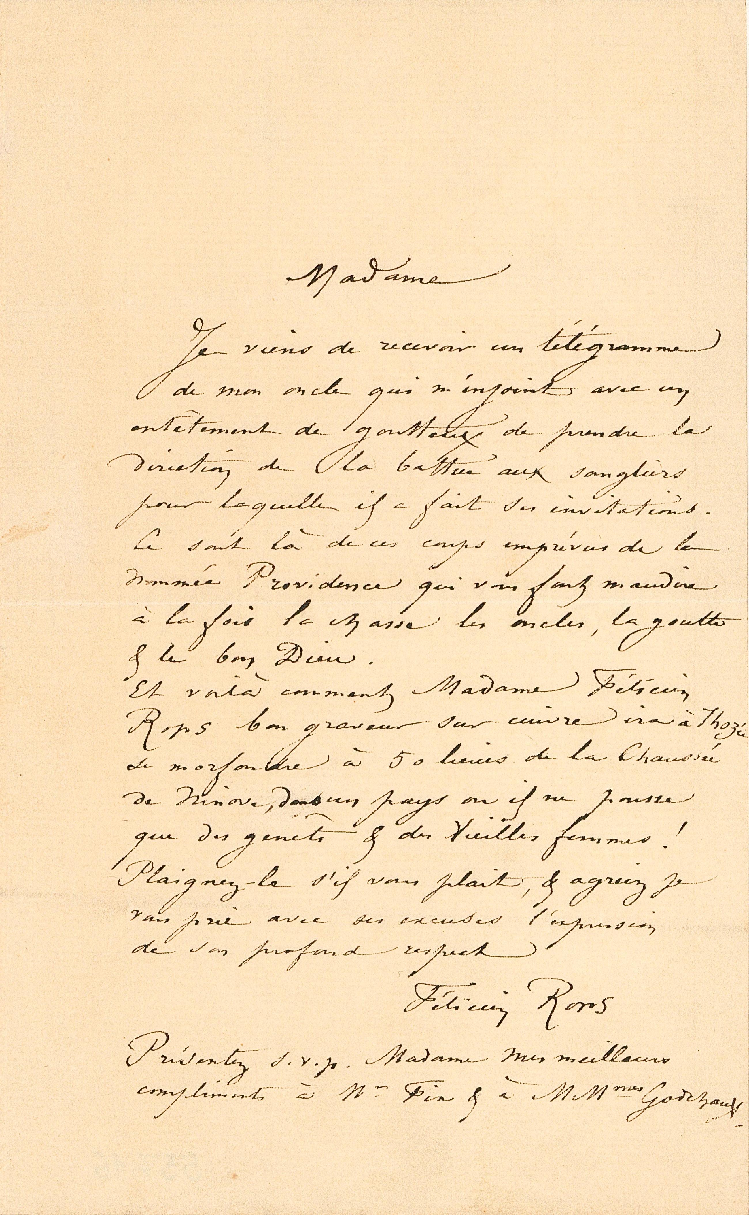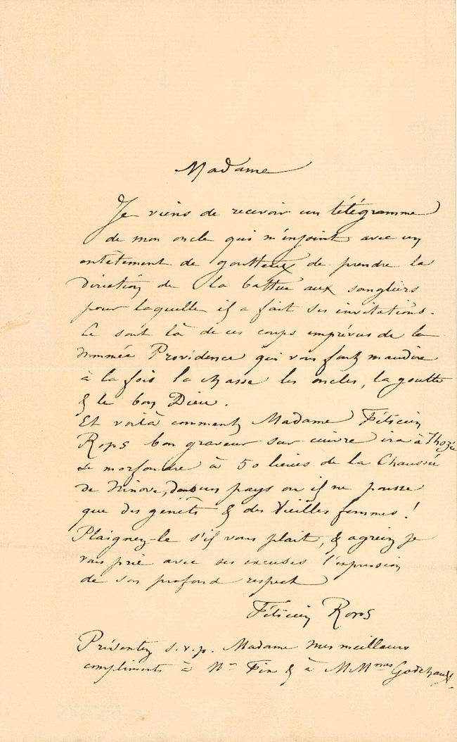 Je viens de recevoir un télégramme de mon oncle qui m’enjoint avec un entêtement de goutteux de prendre la direction de la battue aux sangliers pour laquelle il a fait ses invitations. Ce sont là de ces coups imprévus de la nommée Providence qui vous font maudire à la fois la chasse les oncles la goutte & le bon Dieu. Et voilà comment Madame Félicien Rops bon graveur sur cuivre ira à Thozée se morfondre à 50 lieues de la Chaussée de Ninove, dans un pays ou il ne pousse que des genêts & des vieilles femmes ! Plaignez-le s’il vous plaît, & agréer je vous prie avec ses excuses l’expression de son profond respect.