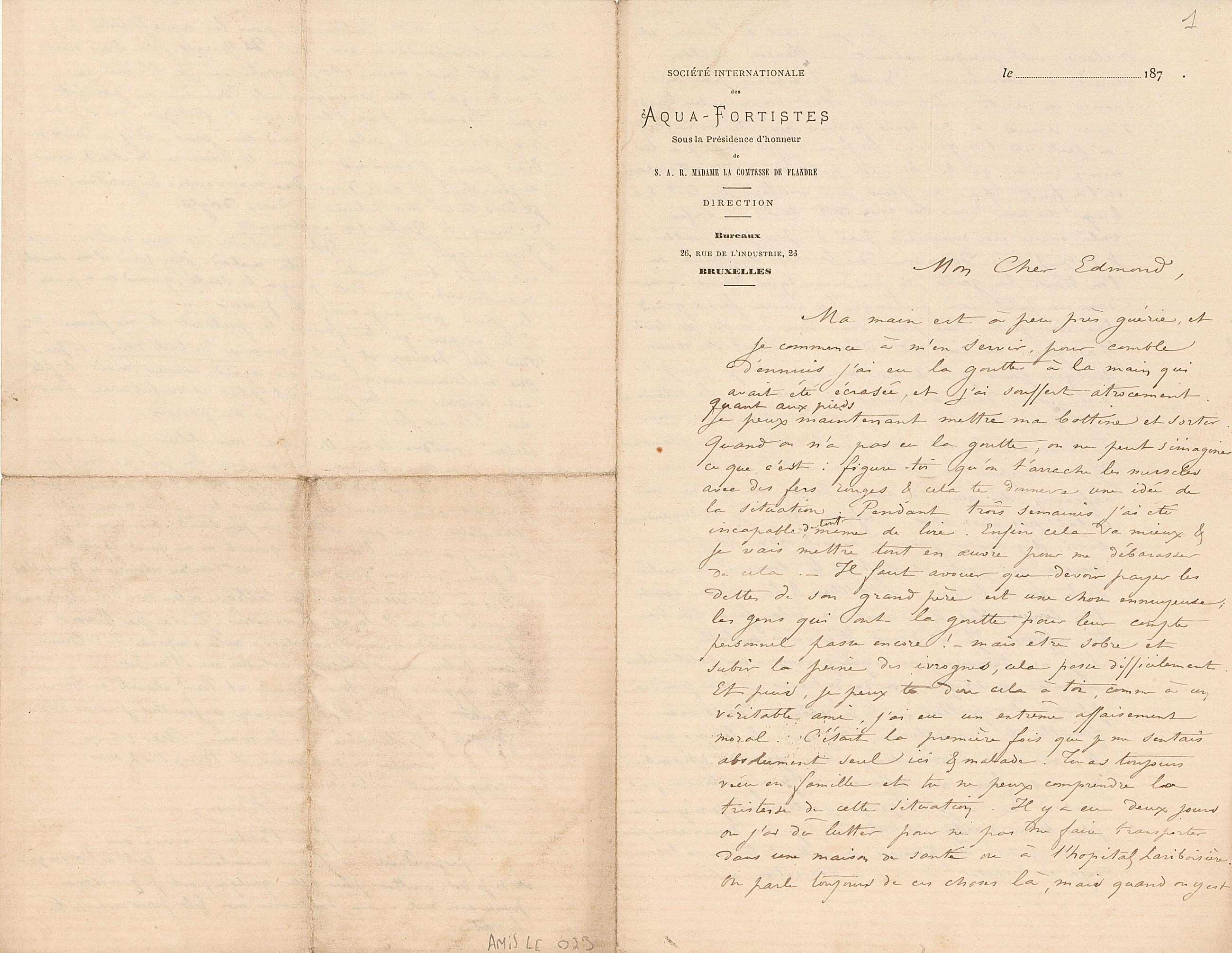 cela touche fortement. Gouzien était à Rouen et Malassis est presque mourant à Alençon. Artan venait de retourner à Berck. Je n’avais pas de chance en vérité. Du reste il est encore plus triste d’avoir recours à ses amis mariés que de rester seul – on sait que l’on gênera les femmes, qui n’ont pas les mêmes raisons que les hommes pour vous être attachées et l’on finit par ne plus rien vouloir du tout & à broyer du noir dans son coin tout seul. – Enfin voilà encore un mauvais pas d’à peu près passé, si je peux, j’irai dans une des localités de bains ou l’on traite la goutte, ou prendre quelques bains de mer dans un petit coin quelconque, ce qui me ferait grand bien car je ne suis plus dans mon assiette du tout. J’ai pensé un instant d’écrire à Paul de venir quelques jours près de moi mais j’ai songé que je le dérangerais dans ses études et que cela le retarderais – et puis on ne l’aurait peut être pas laissé venir ! – Je travaille & cette semaine tu recevras des planches. Je suis disposé à quitter mon atelier de la rue Lefrancq dès que j’en aurai trouvé un qui ne me coutât pas aussi cher. Informe-toi. Je te demanderai aussi d’y laisser jusqu’à nouvel ordre la grande armoire qui y est et dont je te donnerai la moitié si tu en as besoin. L’atelier & la maison sont très convenables & je crois que cela fera très bien ton affaire. Je voudrais t’y voir installé. Si je ne trouve pas ce que je veux – un petit atelier modeste de 25 francs ou de 30 francs, je n’en prendrai plus à Bruxelles, - Si je retourne dans ma famille je travaillerai chez moi le temps que je passerai à Bruxelles, - Une grande chambre pourrait faire mon affaire, si je n’y retourne pas c’est-à-dire si je ne peux y retourner, je n’y aurai plus besoin d’atelier du tout, car je ne demeurerai pas à Bruxelles ! Tu pourrais du reste si tu en as besoin déjà en disposer. Il est à ta disposition entière.