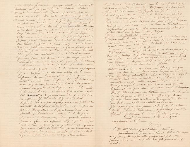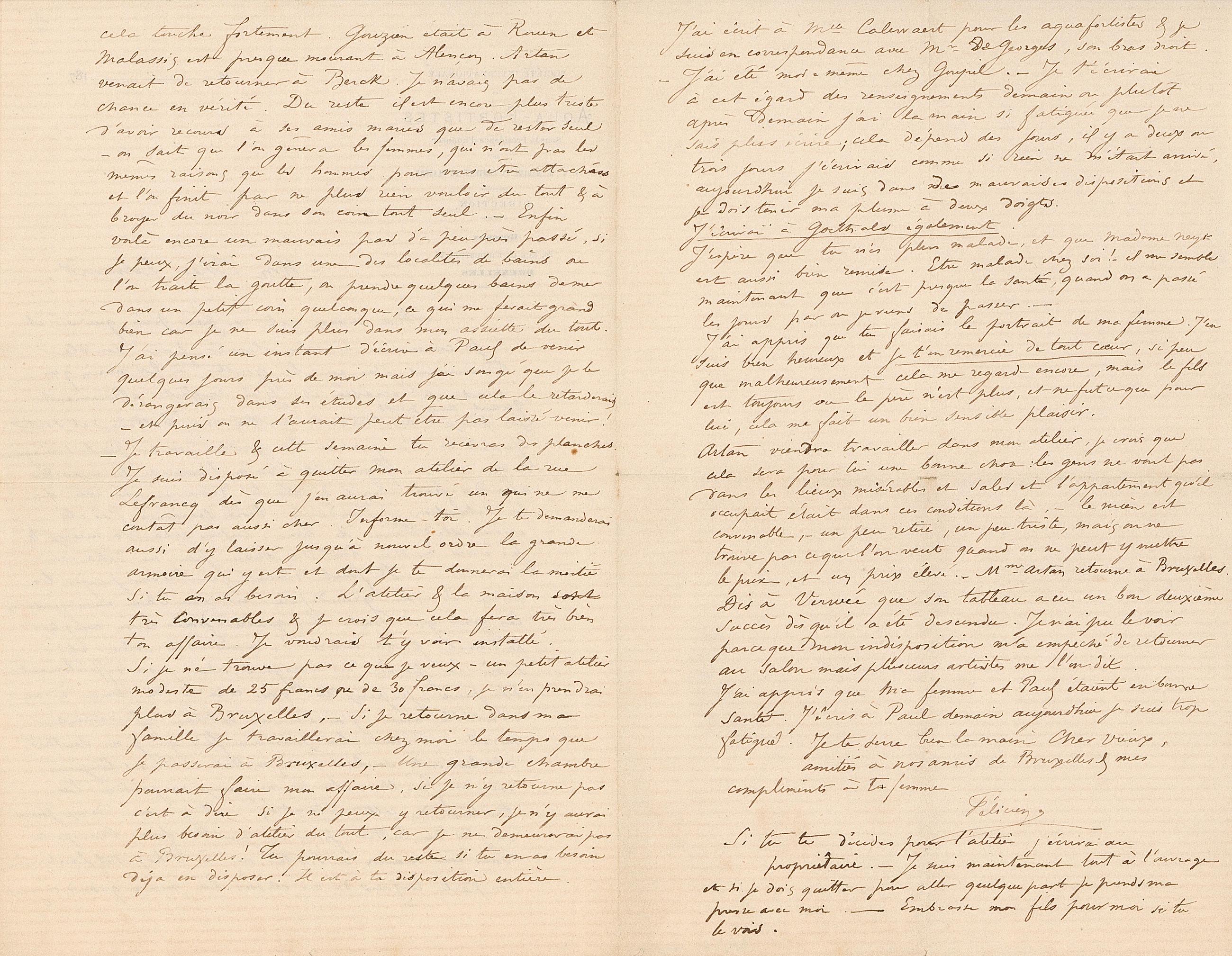 J’ai écrit à Mlle Calewaert pour les aquafortistes & je suis en correspondance avec Mr Degeorges, son bras droit. – J’ai été moi-même chez Goupil. – Je t’écrirai à cet égard des renseignements demain ou, plutôt après demain j’ai la main si fatiguée que je ne sais plus écrire ; cela dépend des jours, il y a deux ou trois jours j’écrivais comme si rien ne m’était arrivé, aujourd’hui je suis dans de mauvaises dispositions et je dois tenir ma plume à deux doigts. J’écrirai à Goethals également. J’espère que tu n’es plus malade, et que Madame Neys est aussi bien remise. Etre malade chez soi ! – il me semble maintenant que c’est presque la santé, quand on a passé les jours par ou je viens de passer. – J’ai appris que tu faisais le portrait de ma femme. J’en suis bien heureux et je t’en remercie de tout cœur, si peu que malheureusement cela me regarde encore, mais le fils est toujours ou le père n’est plus, et ne fut ce que pour lui, cela me fait un bien sensible plaisir. Artan viendra travailler dans mon atelier, je crois que cela sera pour lui une bonne chose : les gens ne vont pas dans les lieux misérables et sales et l’appartement qu’il occupait était dans ces conditions là, - le mien est convenable, - un peu retiré, un peu triste, mais on ne trouve pas ce que l’on veut quand on ne peut y mettre le prix, et un prix élevé. – Mme Artan retourne à Bruxelles. Dis à Verwée que son tableau a eu un bon deuxième succès dès qu’il a été descendu. Je n’ai pu le voir parce que mon indisposition m’a empêché de retourner au salon mais plusieurs artistes me l’ont dit. J’ai appris que ma femme et Paul étaient en bonne santé. J’écris à Paul demain aujourd’hui je suis trop fatigué. Je te serre bien la main Cher Vieux, amitiés à nos amis de Bruxelles & mes compliments à ta femme