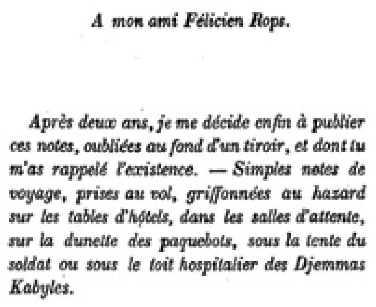 Fig.2 – Détail de la page de dédicace de l’ouvrage : Émile THAMNER, Six semaines dans l’Atlas. Notes d’un touriste. Dijon - Avignon - Nîmes - Arles - Marseille - Alger - Fort - Napoléon - Oued - Sahel - Bougie - Mustapha, Blidah - Medeah - Chiffa, etc, Bruxelles - Leipsick - Nice, Muquardt, 1872.
