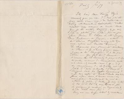 Page 1 Recto : 1Paris le 1er mars 1887MonsieurLa lettre que vous m’avez fait l’honneur de m’écrire, a été par erreur envoyée à la Campagne, le jour où j’en revenais, & ne m’a été retournée qu’aujourd’hui. Je suis au regret, croyez le, de n’avoir pu vous répondre plus tôt, & je vous prie de m’en excuser.– Je vous remercie Monsieur, de votre extrême gracieuseté, & de la flatteuse proposition que vous me faites au nom de vos amis, en me demandant d’être « des vôtres ». Je ne vous apporterai pas l’aide d’un chef ou d’un maître, mais l’appoint de courage d’un simple soldat, non gradé, & dont cependant les bras sont couverts de chevrons & de cicatrices, pour la part modeste mais honorable, qu’il a prise à tous les bons combats dont vous parlez, & où vous marchez à votre tour d’un pas allègre & d’un cœur vaillant.– Je crois que les Arts n’ontPage 1 Verso : 3de vie que par d’incessants avatars. Je crois que « les Jeunes » sont les plus expérimentés, étant en réalité les plus anciens, par la r