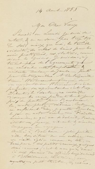 Page 1 Recto : 1Paris, le 28 nov.1887.En grande Hâte !Mon Cher Péladan,Je ne connaissais pas votre adresse, – je tenais à ce que la lettre puisse vous arriver rapidement, je ne pouvais la confier qu’à un ami sûr. – Ce que j’ai fait. Je ne pouvais l’envoyer chez MrCouve, qui eut pu trouver la chose ou déplacée, ou inconvenante. Je n’avais pas le choix des moyens.Je ne comprends rien du tout au propos prétendument répeté par Barroil. Et il me paraît même d’un comique si profond, & d’une niaiserie si profonde également, que vous auriez bien dû, Mon Cher Péladan ne pas croire un instant qu’il m’ait eu pour père.Il y a là des « histoires de femmes » d’une nature spéciale je crois, & à votre retour, je tiens, pour que tout soit éclairci, que nous nous réunissions, avec Uzanne, & que nous fassions quelque lumière sur tout cela. Je dis « Uzanne » parce qu’il a été mêlé à ces propos, & que déja avant votre lettre, il m’enPage 1 Verso : 3avait touché un mot. Seulement dans l’espèce, les rôles ét