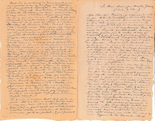 Il ne faut pas m’en vouloir Mon Cher Barrion si je ne vous ai pas encore envoyé d’eaux-fortes & de dessins, ce qui pourrait vous donner de moi une fort bizarre opinion, après la gracieuseté avec laquelle vous avez accédé à ma demande. Je viens de passer une déplorable annee, comme ami, je tiens à ce que vous sachiez à quoi vous en tenir et voici ce que j’écrivais à Nadar, un des amis d’antan & aujourdhui, qui me reprochait de ne rien faire, de vivre retiré, & de devenir misanthrope & misogyne. Voici à peu près ce que je lui disais : « Tu me connais depuis longtemps Mon Cher Vieux, et cependant bien souvent je dois te paraître incompréhensible comme je le suis à moi-même ! J’ai été doué à mon berceau par beaucoup de belles personnes qui exerçaient la profession de fées, et qui étaient invitées par ma mère à venir doter son fils d’une foule de dons variés. Mais on avait oublié de convier à cette petite cérémonie une vieille Fée, celle qu’on oublie toujours ! la Fée Bancroche ! Elle est
