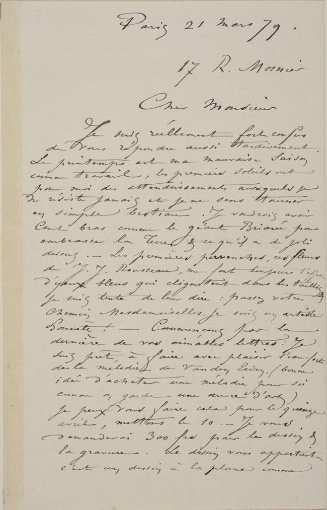 Je suis réellement fort confus de vous répondre aussi tardivement. Le printemps est ma mauvaise saison comme travail, les premiers soleils ont pour moi des attendrissements auxquels je ne résiste jamais et je me sens tourner en simple bestiau. Je voudrais avoir cent bras comme le géant Briarée pour embrasser la Terre & ce qu’il a de joli dessus. – Les premières pervenches, ces fleurs de J. J. Rousseau, me font toujours l’effet d’yeux bleus qui clignotent dans les taillis & je suis tenté de leur dire : passez votre chemin Mesdemoiselles, je suis un artiste honnête ! – Commençons par la dernière de vos aimables lettres : Je suis prêt à faire avec plaisir l’eau-forte de la mélodie de Van den Eeden, (bonne idée d’acheter une mélodie pour soi comme on garde une œuvre d’art) je peux vous faire cela pour le quinze avril, mettons le 10. – Je vous demanderai 300 frs pour le dessin & la gravure. Le dessin vous appartient c’est un dessin à la plume comme