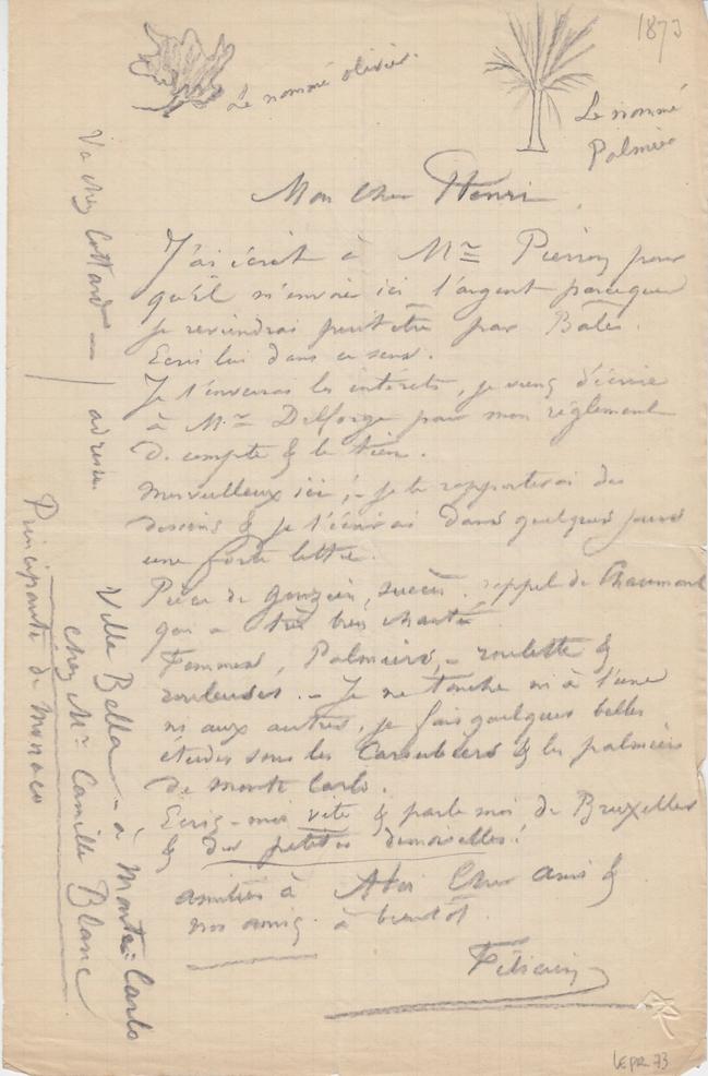 Femmes, Palmiers, – roulette & rouleuses. – Je ne touche ni à l’une ni aux autres, je fais quelques belles études sous les Caroubiers & les palmiers de Monte Carlo.
