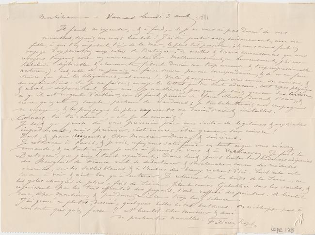 Je retourne à Paris, & je vais, enfin vous satisfaire en tout ce que vous m’avez demandé, & en tout ce que je vous ai promis, à vous & à Verhaeren. Je fuis la Bretagne, que j’aime tant cependant : Dans huit jours toutes les hideuses