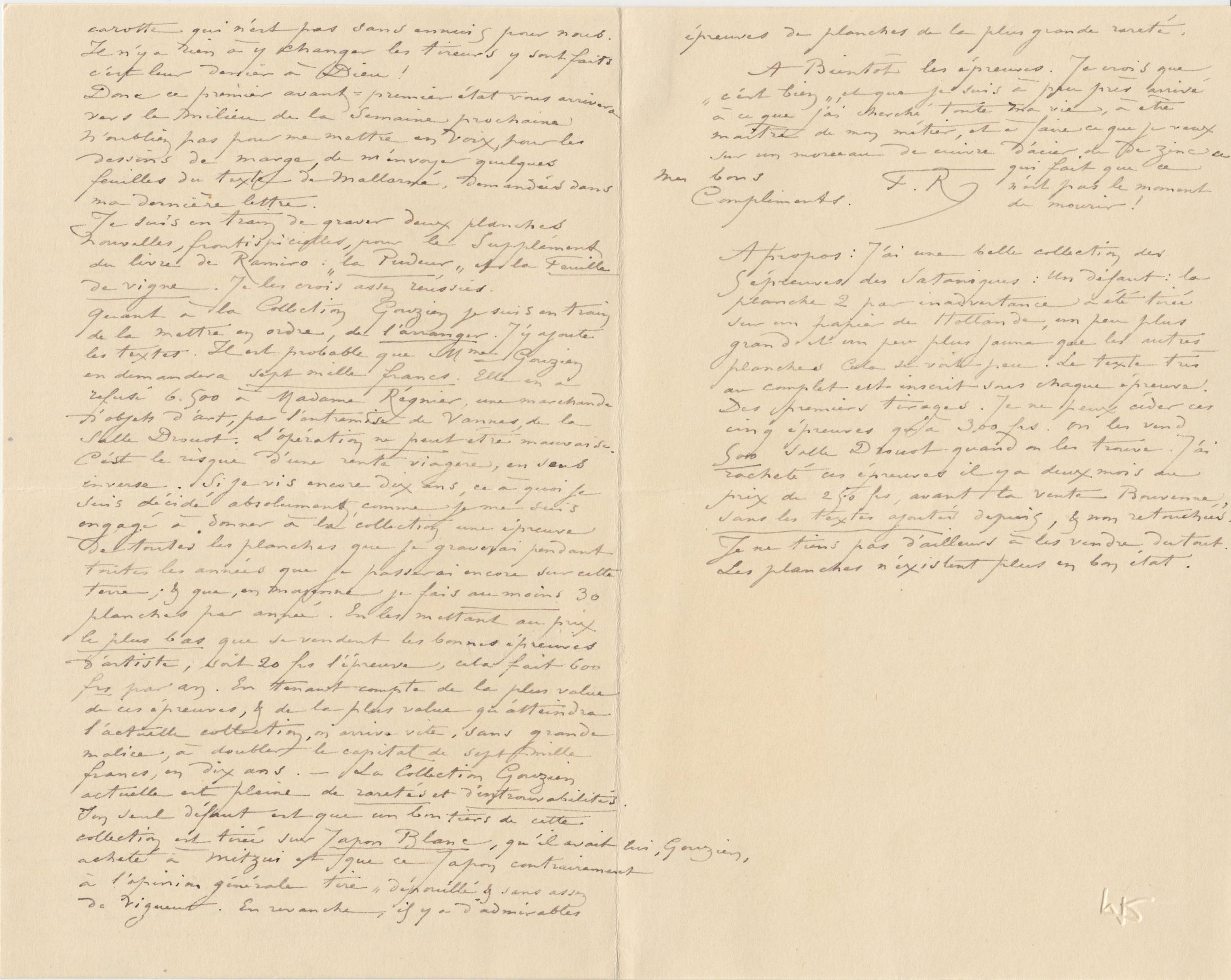 Quant à la Collection Gouzien je suis en train de la mettre en ordre, de l’arranger. J’y ajoute les textes. Il est probable que Mme Gouzien en demandera sept mille francs. Elle en a refusé 6.500 à Madame Régnier, une marchande d’objets d’art, par l’entremise de Vannes, de la Salle Drouot. L’opération ne peut être mauvaise. C’est le risque d’une rente viagère, en sens inverse. Si je vis encore dix ans, ce à quoi je suis décidé absolument, comme je me suis engagé à donner à la collection une épreuve de toutes les planches que je graverai pendant toutes les années que je passerai encore sur cette terre ; & que, en moyenne je fais au moins 30 planches par année. En les mettant au prix le plus bas que se vendent les bonnes épreuves d’artiste, soit 20 frs l’épreuve, cela fait 600 frs par an. En tenant compte de la plus value de ces épreuves, & de la plus value qu’atteindra l’actuelle collection, on arrive vite, sans grande malice, à doubler le capital de sept mille francs, en dix ans. – La Collection Gouzien actuelle est pleine de raretés et d’