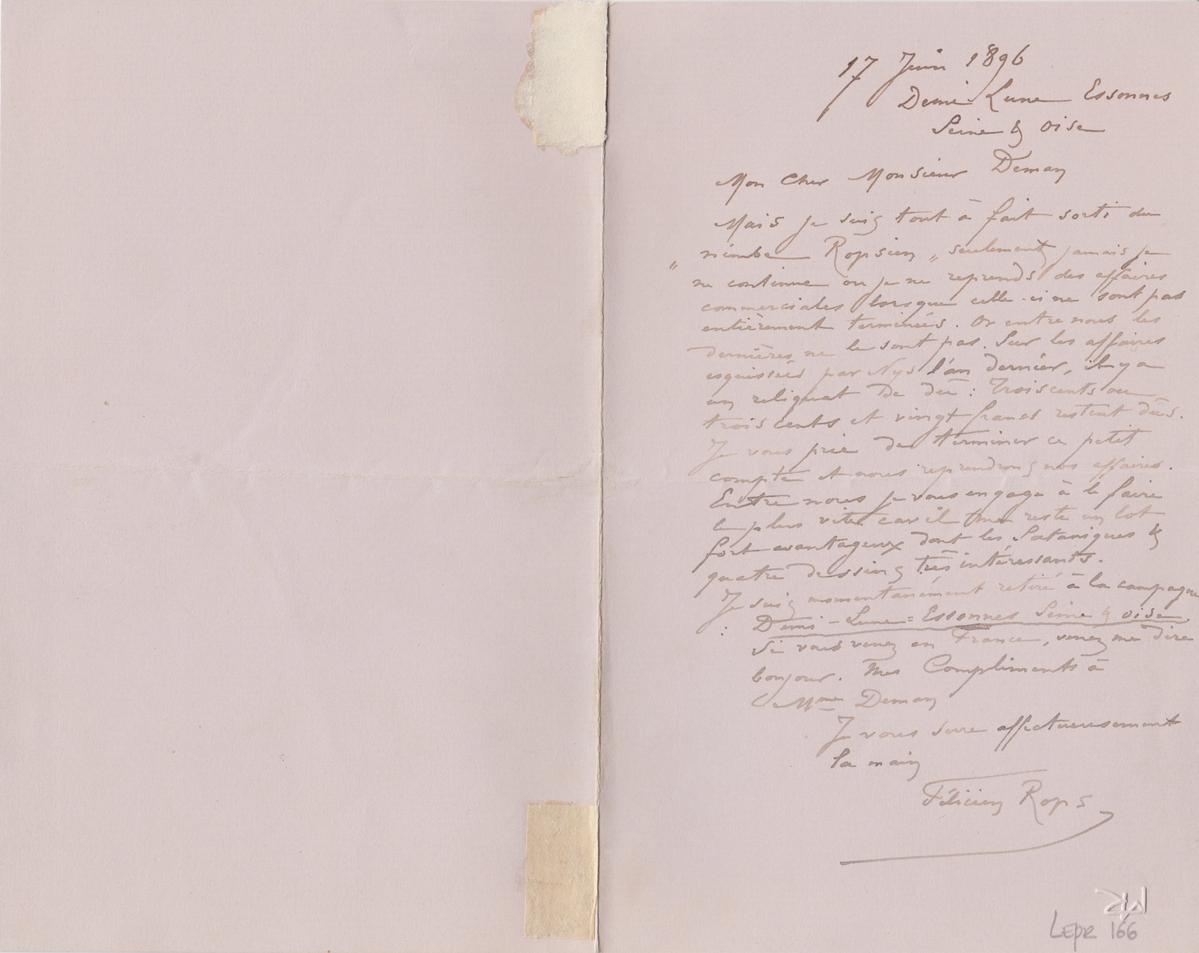 Mais je suis tout à fait sorti du « nimbe Ropsien » seulement jamais je ne continue ou je ne reprends des affaires commerciales lorsque celle-ci ne sont pas entièrement terminées. Or entre nous les dernières ne le sont pas. Sur les affaires esquissées par Nys l’an dernier, il y a un reliquat de dû : Trois cents ou trois cents et vingt francs restent dûs. Je vous prie de terminer ce petit compte et nous reprendrons nos affaires. Entre nous je vous engage à le faire le plus vite car il me reste un lot fort avantageux dont les Sataniques & quatre dessins très intéressants.