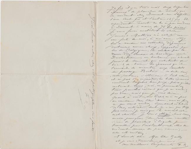 70 frs il y a trois mois deux superbes épreuves de planches de Tissot qui se vendent chez Dumont rue Laffitte l’une Cent frs et l’autre 125 frs. Et cependant Tissot ne les a pas vendues à Dumont à moins de 75 frs pièce. Je vous ferai constater la chose. Jamais Mathias n’a acheté une eau-forte de moi, à moi même. Nys lui a vendu une collection d’épreuves douteuses comme choix, rapportée par lui de Belgique, et vendue par la veuve d’un boursier de bas étage appelé Duchâteau, un bonhomme qui n’avait jamais le sou, et qui achetait de bric & de broc les épreuves qu’il trouvait de rencontre aux camelots du passage Bortier. – on doit dans « cette partie » s’attendre à tout cela, et ne pas s’en inquiéter ; les belles épreuves vaudront toujours leur prix, parce qu’elles resteront rares, moi, ne pouvant en tirer pour des raisons que je ne voulais pas dire, mais que je vous dirai.