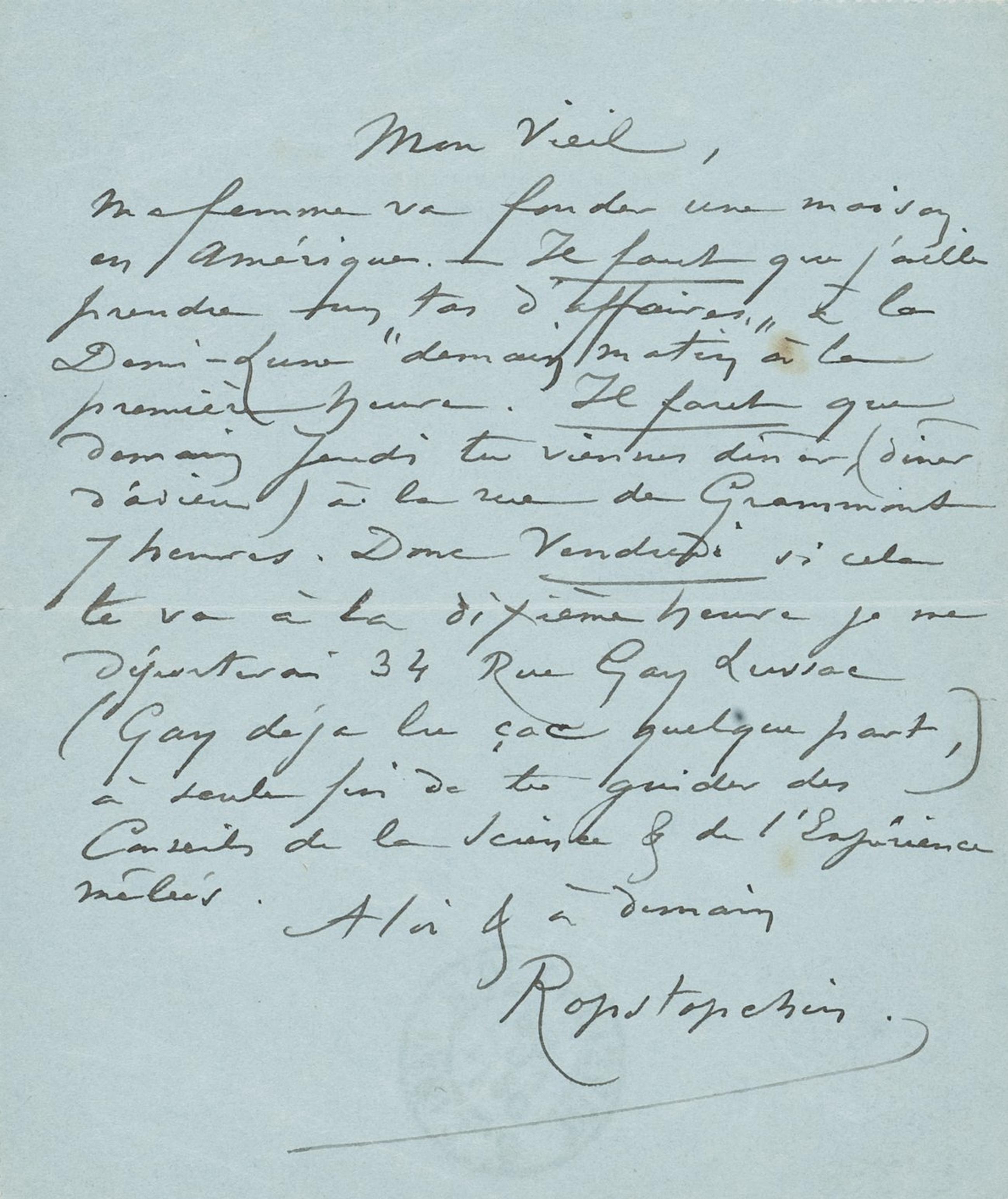 Ma femme va fonder une maison en Amérique. – Il faut que j’aille prendre un « tas d’affaires. » à la Demi-Lune demain matin à la première heure. Il faut que demain Jeudi tu viennes dîner, (dîner d’adieu) à la rue de Grammont 7 heures. Donc Vendredi si cela te va à la dixième heure je me déporterai 34 Rue Gay Lussac (Gay déja lu ça quelque part,) à seule fin de te guider des Conseils de la Science & de l’Expérience mêlées.