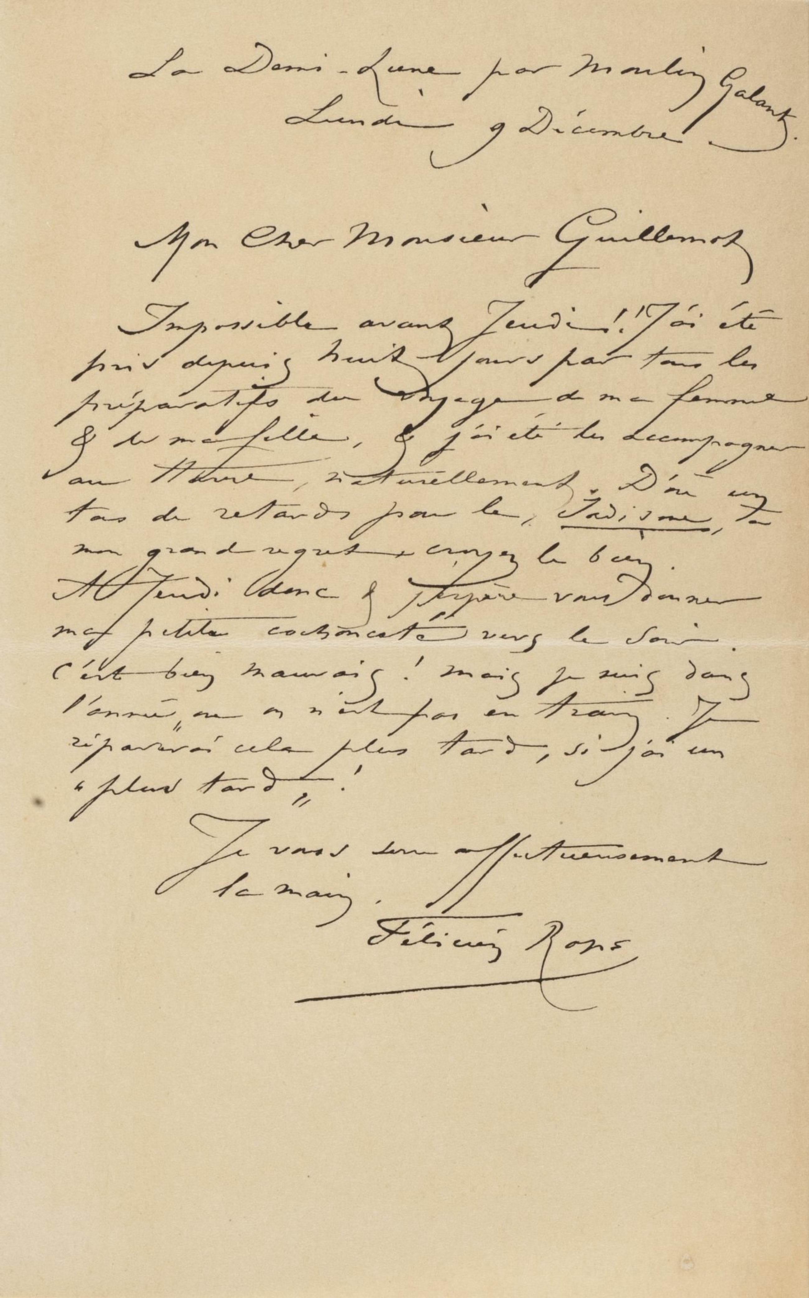 Impossible avant Jeudi !! J’ai été pris depuis huit jours par tous les préparatifs du voyage de ma femme & de ma fille, & j’ai été les accompagner au Hâvre, naturellement. D’où un tas de retards pour le, Jadisme, à mon grand regret, croyez le bien.