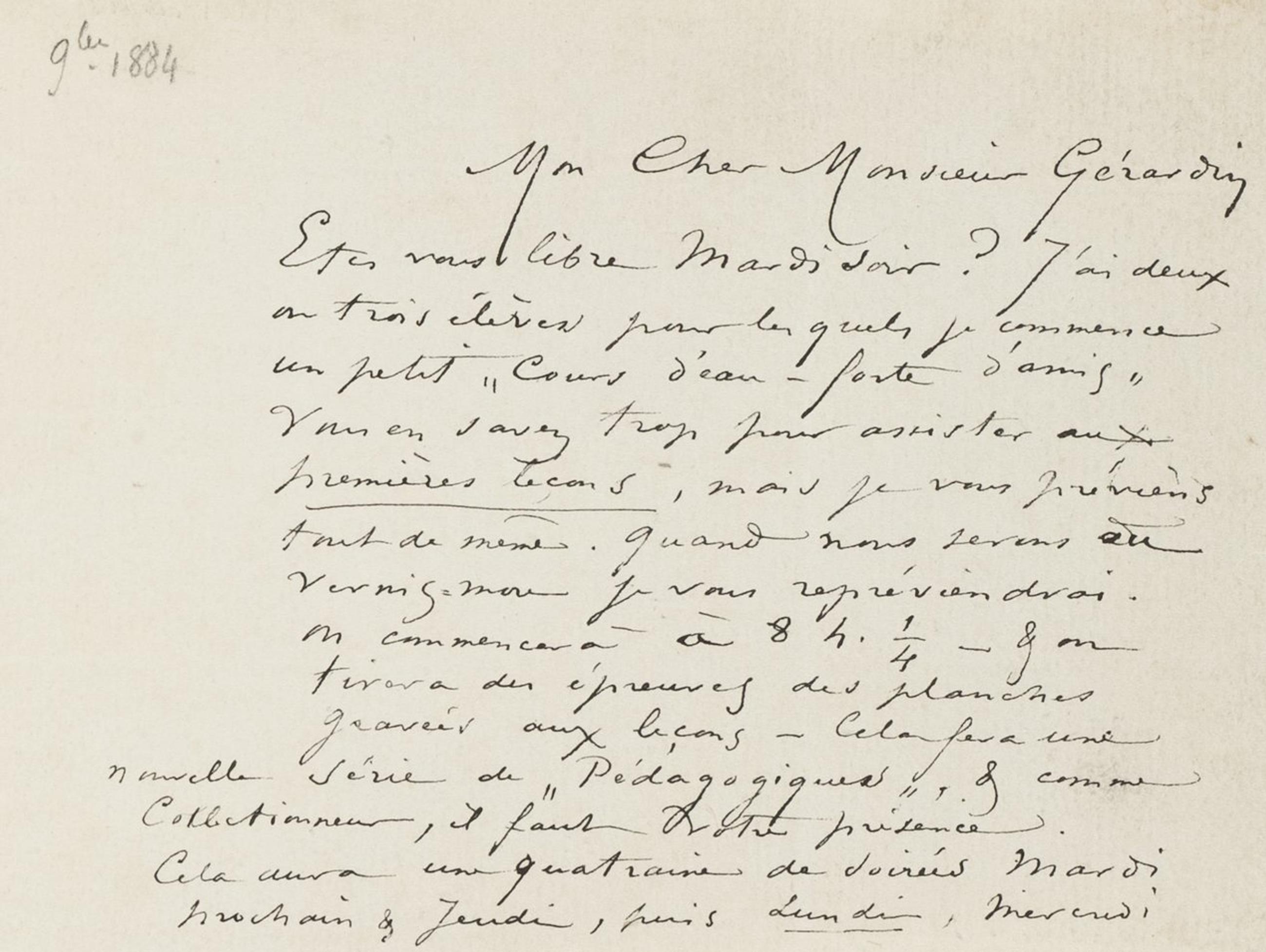 Êtes vous libre Mardi soir ? J’ai deux ou trois élèves pour lesquels je commence un petit « Cours d’eau-forte d’amis » Vous en savez trop pour assister aux premières leçons, mais je vous préviens tout de même. Quand nous serons au vernis-mou je vous repréviendrai. On commencera à 8 h. ¼ – & on tirera des épreuves des planches gravées aux leçons – Cela fera une nouvelle Série de « Pédagogiques », & comme Collectionneur, il faut votre présence. Cela aura une quatraine de soirées Mardi prochain & Jeudi, puis Lundi, Mercredi