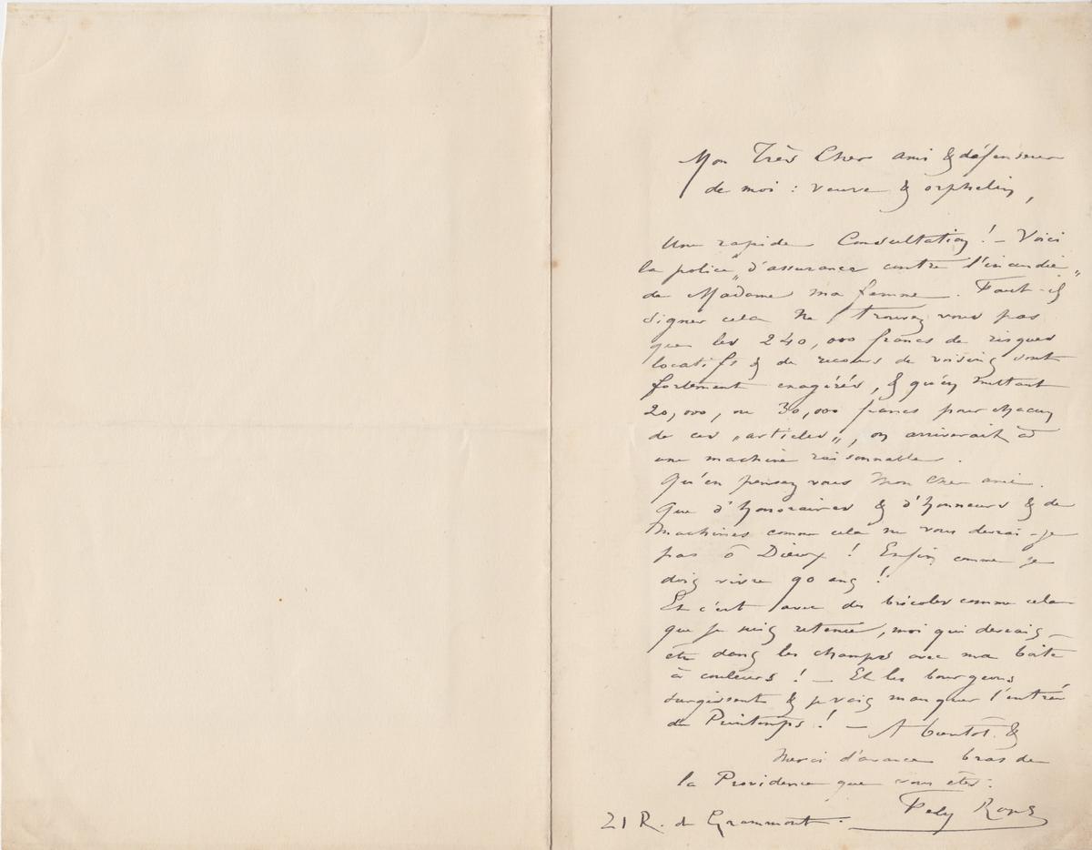 Une rapide Consultation ! – Voici la police « d’assurance contre l’incendie » de Madame ma femme. Faut-il signer cela Ne trouvez vous pas que les 240,000 francs de risques locatifs & de recours de voisins sont fortement exagérés, & qu’en mettant 20,000, ou 30,000 francs pour chacun de ces « articles », on arriverait à une machine raisonnable.