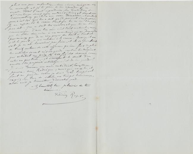 J’ai dû quitter la Demi-Lune sans passer par Paris pour m’éviter une journée fatiguante. En quittant notre train nous sommes montés dans le train de Lyon. – j’avais bien envie de t’envoyer une dépêche pour te dire de venir me dire au revoir à la gare, mais à Haraucourt et à mon docteur à qui j’avais donné rendez vous, j’ai dû télégraphier trois fois toujours une chose ou l’autre me faisant remettre mon départ. Je suis du reste parti tout raséréné par la constatation du nombre d’amis inconnus qui se sont manifestés à cause de l’exposition de la rue Drouot ; – où la jolie préface du catalogue a tant aidé à éclairer ceux qui n’étaient pas initiés à ce que l’on veut bien appeler « mon œuvre ». – C’est pour te remercier très chaleureusement de cet acte d’extrême gracieuseté et de belle amitié que j’aurais voulu te voir. Ensuite a paru le bizarre & magistral article d’Haraucourt dont je suis très fier d’être le héros avec son pile et sa face. – L’un ne va pas sans l’autre. Je ne sais si ce sont toutes ces satisfactions artistiques, où le doux pays où me voici installé, mais je me sens revivre moralement et physiquement et je me sens le désir de refaire de beaux dessins, ce qui va avoir lieu ; si Pellet s’imagine que je suis à peu près mort, et qu’il peut se livrer sur ma personne et sur mes œuvres à tous les massacres possibles, je crois qu’il se trompe et qu’il trouvera à qui parler. Je le trouve assez naïf et en