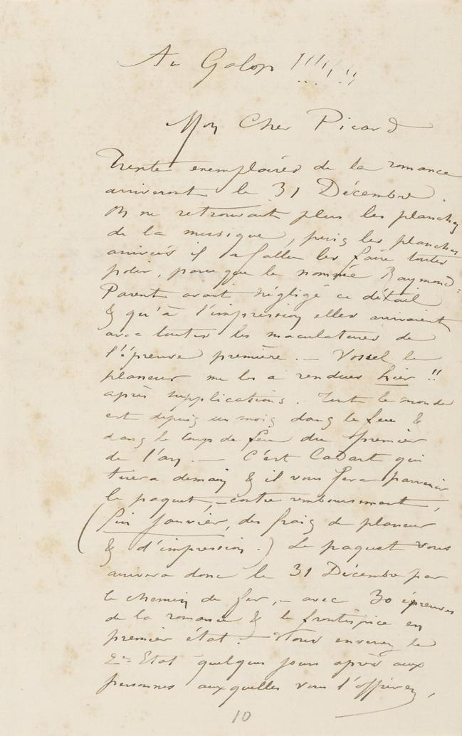 Trente exemplaires de la romance arriveront le 31 Décembre. On ne retrouvait plus les planches de la musique, puis les planches arrivées il a fallu les faire toutes polir, parce que le nommé Raymond-Parent avait négligé ce détail & qu’à l’impression elles arrivaient avec toutes les maculatures de l’épreuve première. – Vossel le planeur me les a rendues hier !! après supplications. Tout le monde est depuis un mois dans le feu & dans le coup de feu du premier de l’an. – C’est Cadart qui tirera demain & il vous fera parvenir le paquet, – contre remboursement, (fin janvier, des frais de planeur & d’impression.) Le paquet vous arrivera donc le 31 Décembre par le chemin de fer, – avec 30 épreuves de la romance & le frontispice en premier état. Vous enverrez le 2e État quelques jours après aux personnes auxquelles vous l’offrirez.