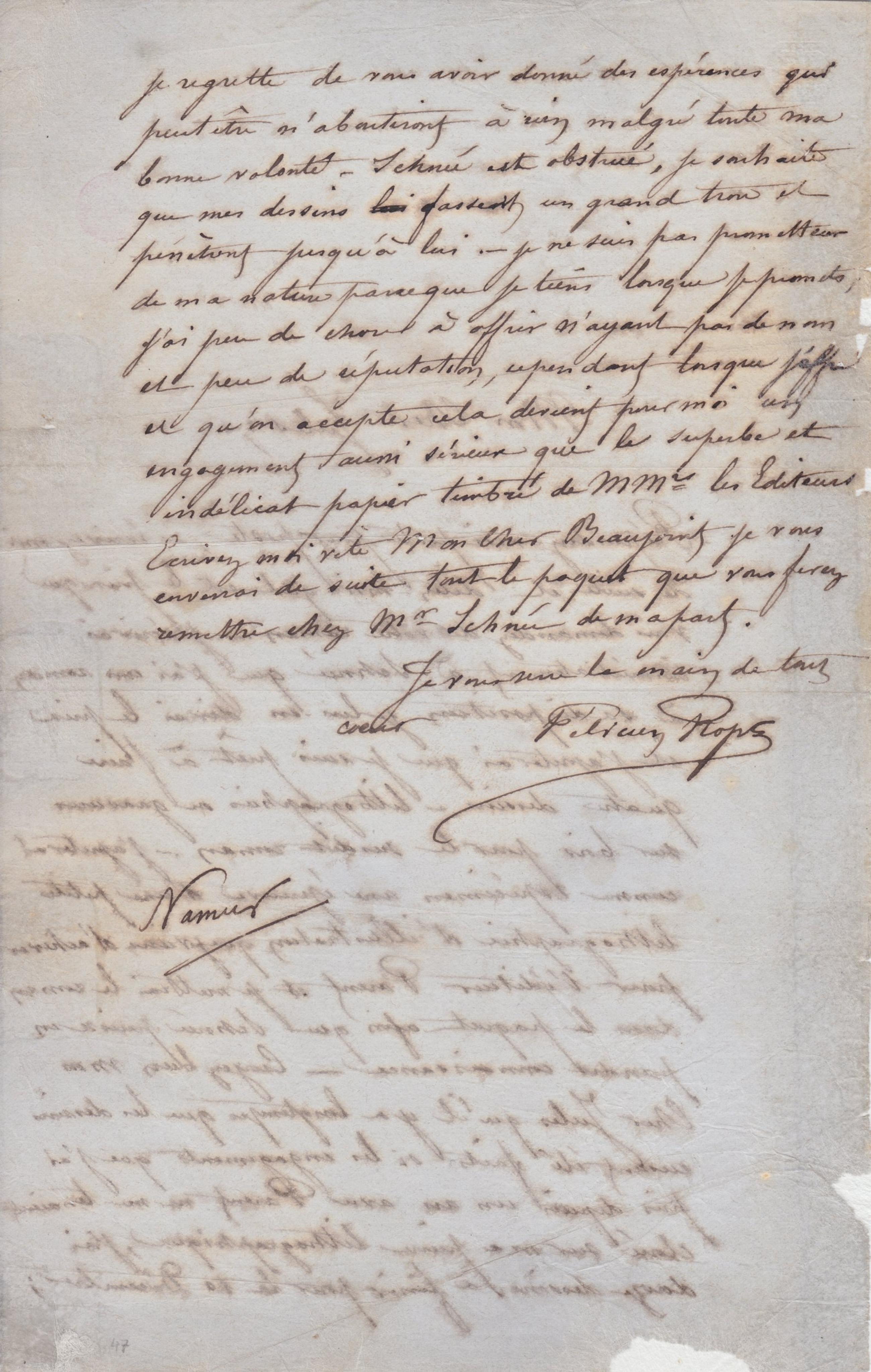 je regrette de vous avoir donné des espérances qui peut être n’aboutiront à rien malgré toute ma bonne volonté – Schnée est obstrué, je souhaite que mes dessins lui fassent un grand trou et pénètrent jusqu’à lui. – je ne suis pas prometteur de ma nature parce que je tiens lorsque je promets, j’ai peu de chose à offrir n’ayant pas de nom et peu de réputation, cependant lorsque j’offre et qu’on accepte cela devient pour moi un engagement aussi sérieux que le superbe et indélicat papier timbré de MMrs les Éditeurs