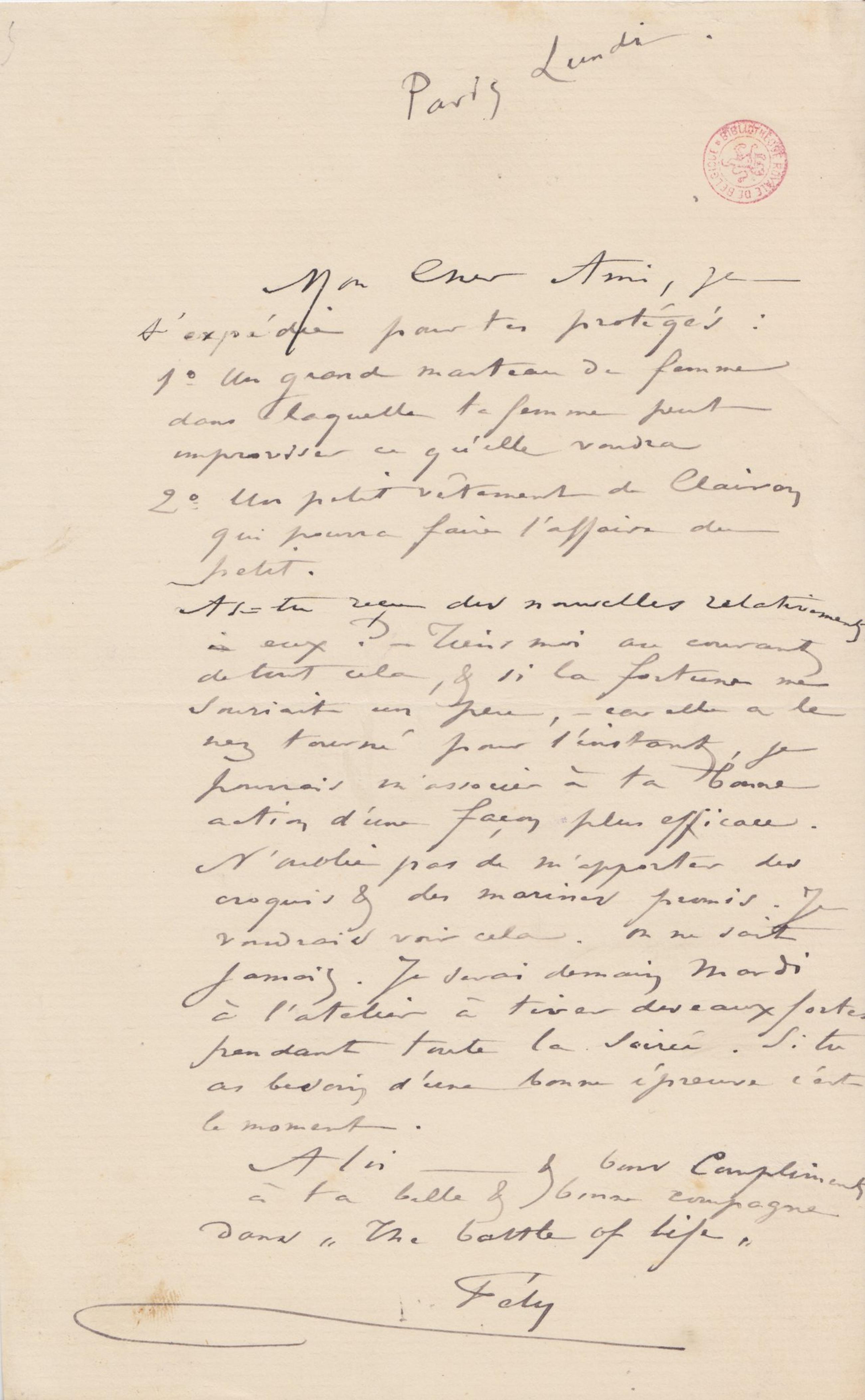 As-tu reçu des nouvelles relativement à eux ? – Tiens moi au courant de tout cela, & si la fortune me souriait un peu, – car elle a le nez tourné pour l’instant, je pourrais m’associer à ta bonne action d’une façon plus efficace. N’oublie pas de m’apporter des croquis & des marines promis. Je voudrais voir cela. on ne sait jamais. Je serai demain Mardi à l’atelier à tirer des eaux fortes pendant toute la soirée. Si tu as besoin d’une bonne épreuve c’est le moment.