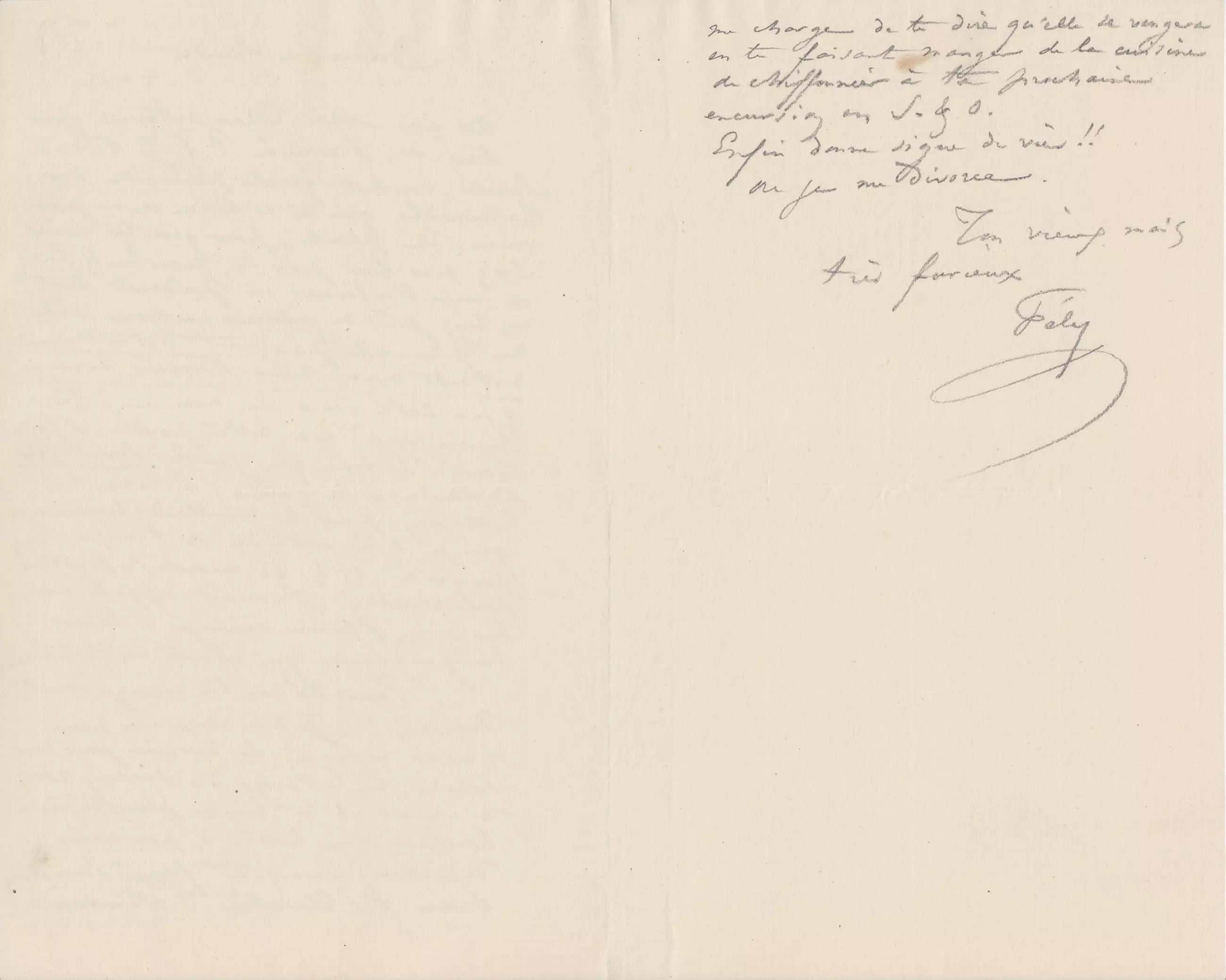 Or ça Mon Cher Octave que t’es-t-il arrivé ?? Je t’écris Samedi, voyant qu’il pleuvait des hallebardes que tu es libre de ne pas venir s’il pleut, pour que tu ne sois pas lié par ta parole & forcé de venir t’enfermer ici pendant tout un long jour de pluie ; – donc s’il ne pleuvait pas, tout naturellement restait comme nous l’avions arrangé & ma lettre était non avenue ! Trois heures après ma lettre partie, il faisait beau. Si beau que j’ai été Samedi soir t’attendre à la gare. Si beau le lendemain par le brouillard lumineux que je t’ai attendu de train en train jusqu’à 11 h. 30 avant de partir pour Saclay. On avait apporté de Paris un lièvre arrangé à la bourguignonne qui était un chef d’œuvre